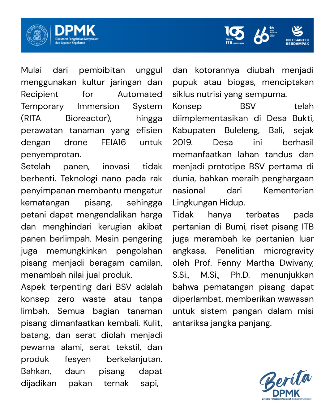 Not limited to agriculture on Earth, ITB's banana research also extends to space agriculture. Microgravity research by Prof. Fenny Martha Dwivany, S.Si., M.Si., Ph.D. shows that banana ripening can be slowed, providing insights for food systems in long-term space missions. Additionally, banana peel waste is also being explored as a natural dye for silk fabric, supporting local weaving traditions. To expand their reach, farmers are now also utilizing the digital application Antar-antar Pisang to facilitate sales.