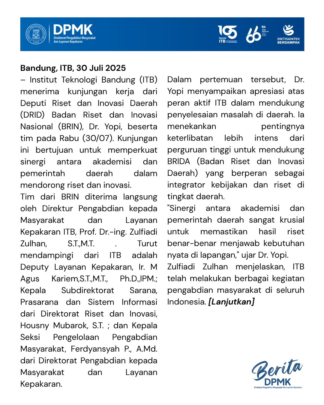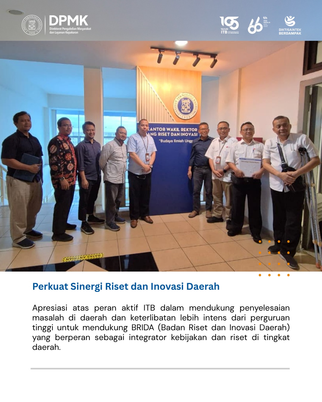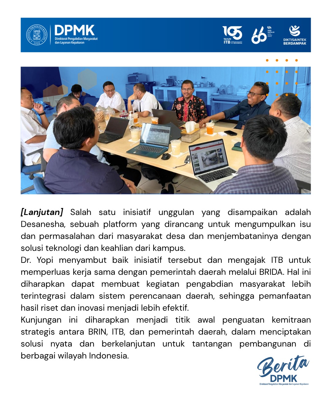 Dr. Yopi welcomed the initiative and invited ITB to expand cooperation with local governments thru BRIDA. This is expected to make community service activities more integrated into the regional planning system, thereby making the utilization of research and innovation results more effective.