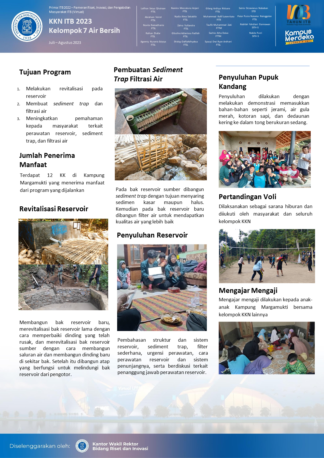 Kampung Margamukti, yang terletak di Dusun Margawati, Desa Cimarga, Kabupaten Sumedang, menghadapi tantangan signifikan terkait sistem air bersih. Sebagai kampung terjauh dari pusat pemerintahan desa, sistem pengairan mereka berasal dari sumber mata air yang ditampung dalam dua reservoir yang terletak di dua lokasi pemukiman yang berbeda. Namun, sistem ini sering mengalami keruh, kotor, dan terdapat sedimen yang terbawa, terutama pada musim hujan. Kelompok 07 KKN Tematik ITB 2023 dengan tema air bersih telah menginisiasi program untuk memperbaiki sistem air bersih di Kampung Margamukti.