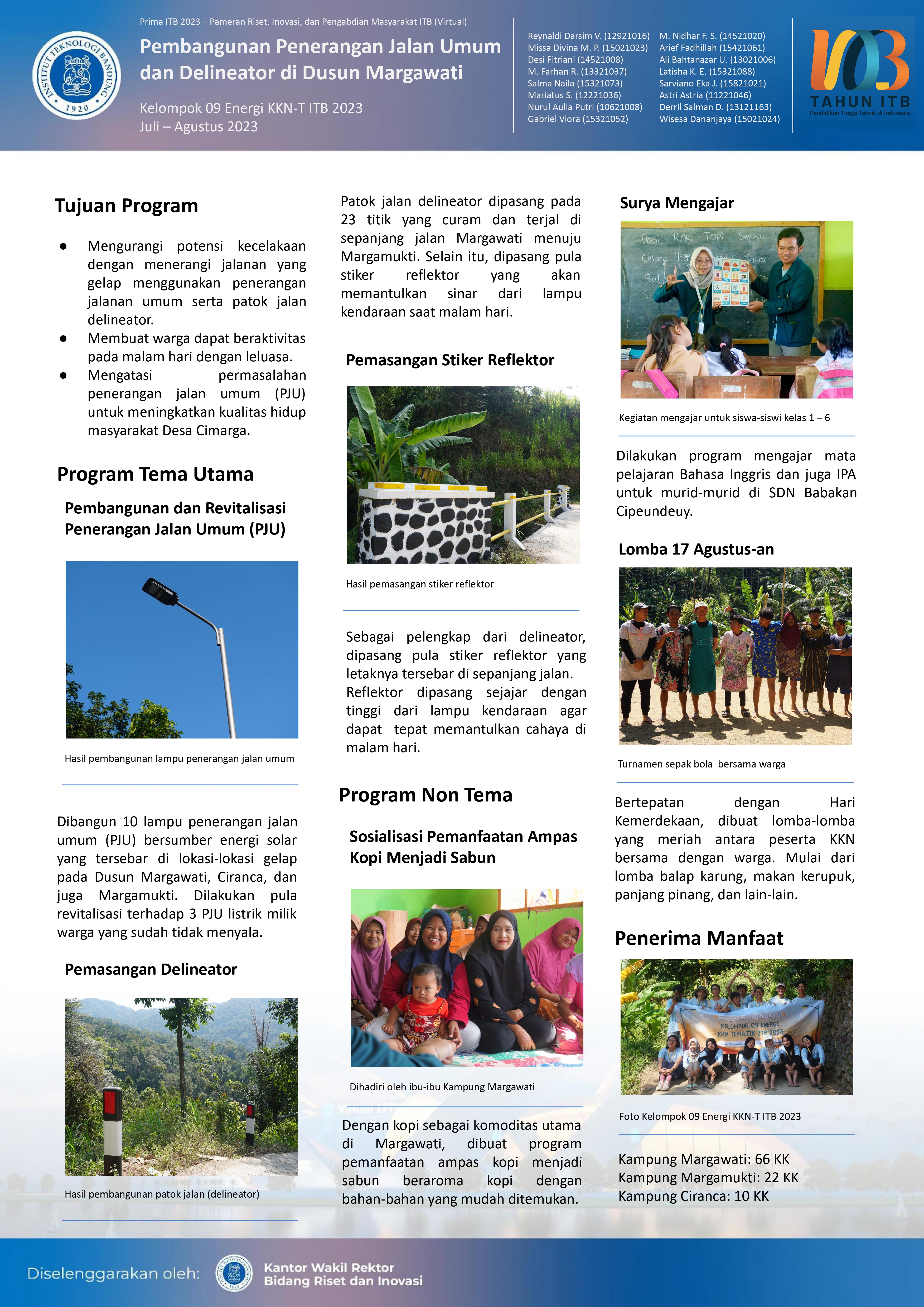 Dalam upaya mengatasi tantangan tersebut, Kelompok 09 KKN ITB dengan tema energi di Desa Cimarga mengambil langkah proaktif dengan memfokuskan pada pemasangan lampu jalan berbasis solar panel. Program ini bertujuan untuk meningkatkan penerangan jalan umum, meminimalkan potensi kecelakaan, dan mendukung aktivitas masyarakat pada malam hari. Melibatkan K09 Energi KKN Tematik ITB 2023 dan partisipasi aktif masyarakat lokal, program ini tidak hanya mengatasi masalah infrastruktur, tetapi juga mendorong semangat gotong royong yang merupakan nilai khas dalam kehidupan masyarakat Desa Cimarga.