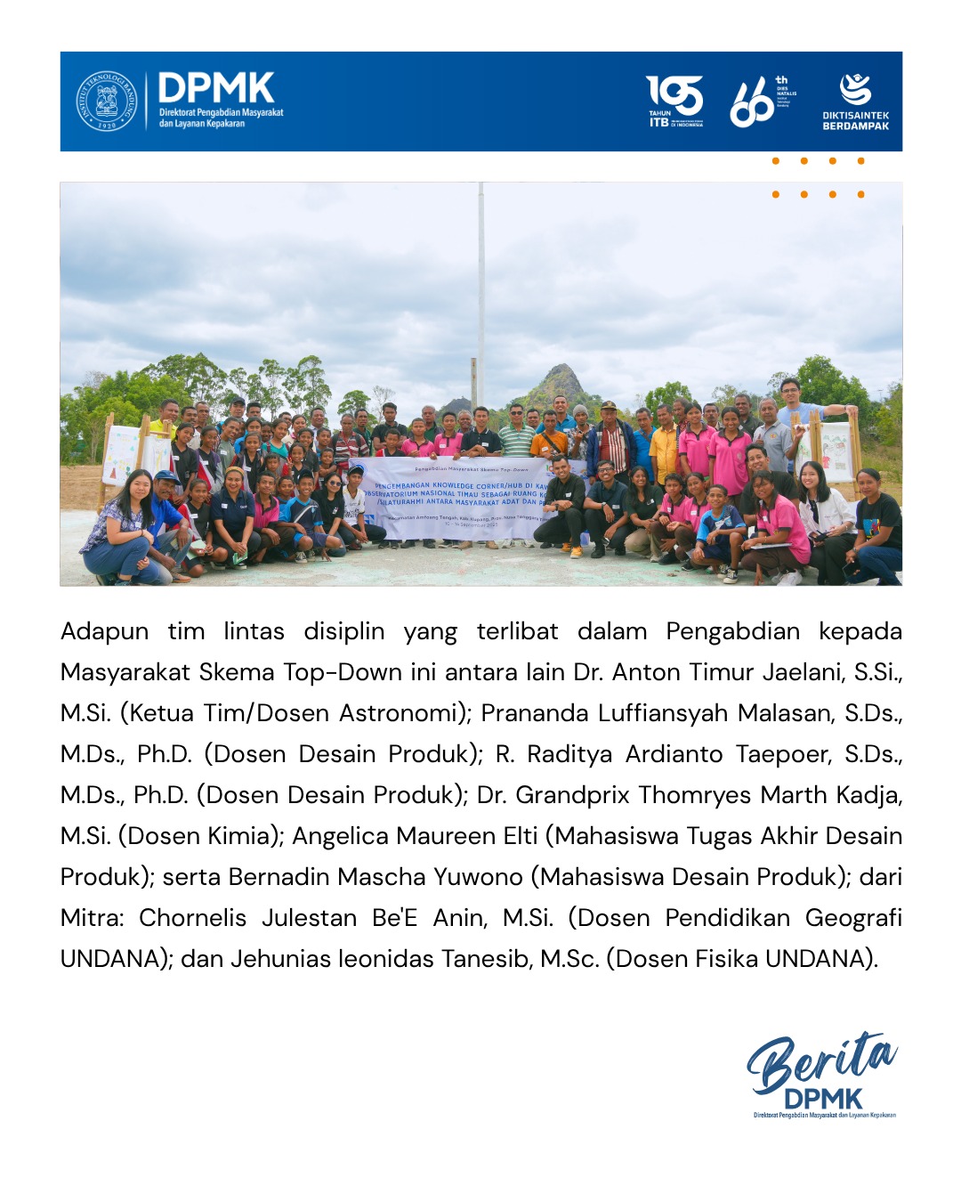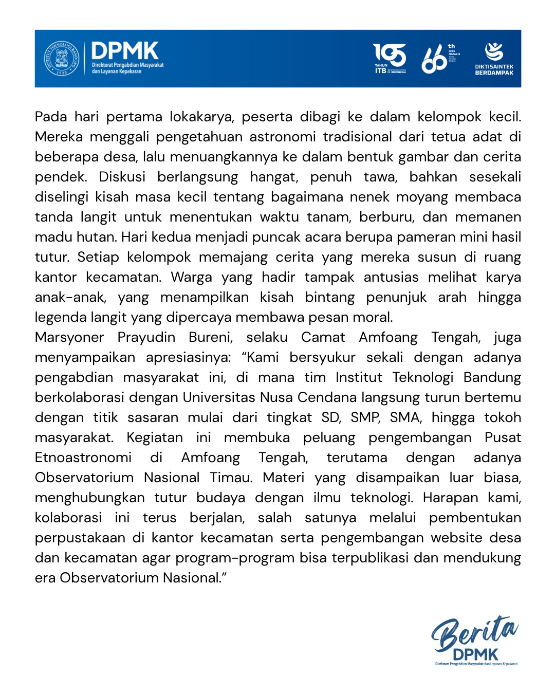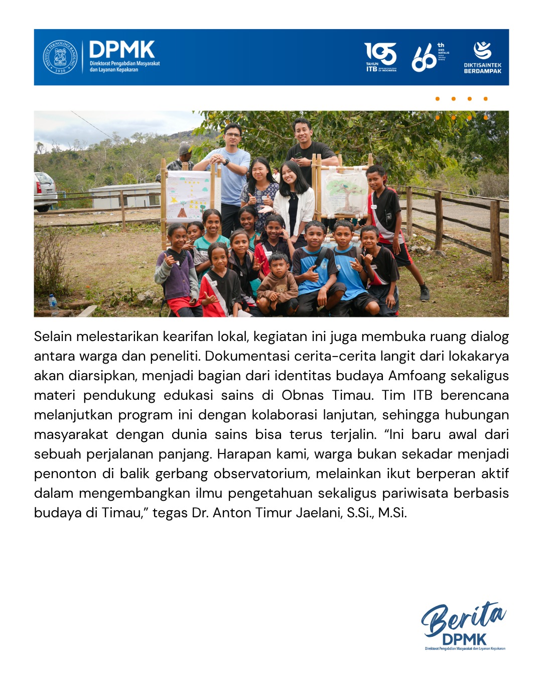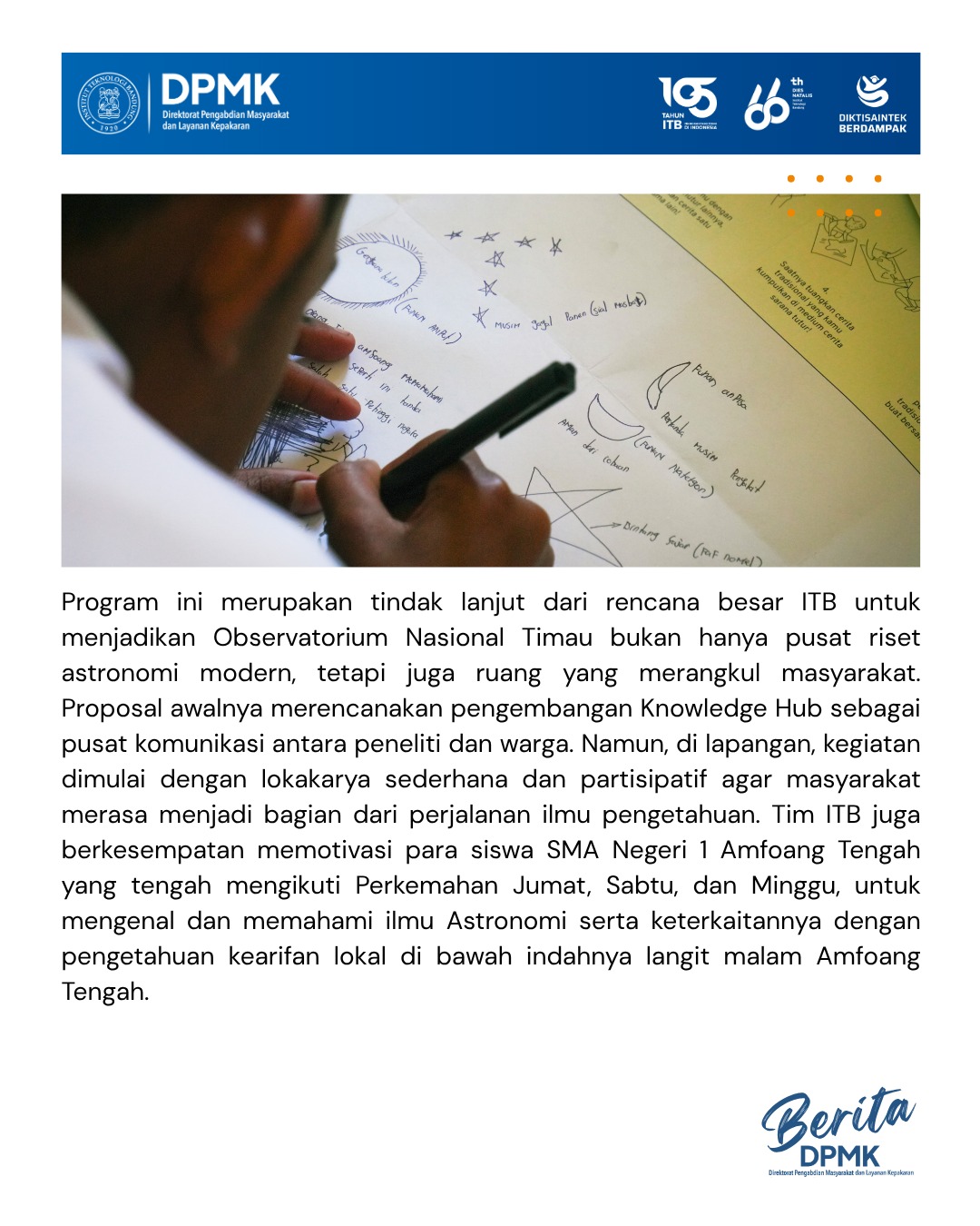 Marsyoner Prayudin Bureni, as the Head of Amfoang Tengah District, also expressed his appreciation: "We are very grateful for this community service, where the team from the Bandung Institute of Technology collaborated with Nusa Cendana University to directly meet with the target points, from elementary, junior high, and high school levels to community leaders. This activity opens up opportunities for the development of an Ethnoastronomy Center in Central Amfoang, especially with the presence of the Timau National Observatory. The material presented was outstanding, connecting cultural narratives with science and technology. Our hope is that this collaboration will continue, one way being thru the establishment of libraries in sub-district offices and the development of village and sub-district websites so that programs can be published and support the era of the National Observatory. This program is a follow-up to ITB's grand plan to make the National Observatory in Timau not only a center for modern astronomical research, but also a space that embraces the community. The proposal initially planned to develop the Knowledge Hub as a communication center between researchers and citizens. However, on the ground, the activities began with simple and participatory workshops so that the community would feel like they were part of the scientific journey. The ITB team also had the opportunity to motivate the students of Amfoang Tengah State High School 1, who were participating in the Friday, Saturday, and Sunday Camping, to learn about and understand the science of Astronomy and its connection to local wisdom under the beautiful nite sky of Amfoang Tengah. In addition to preserving local wisdom, this activity also opened a space for dialog between residents and researchers. The documentation of the sky stories from the workshop will be archived, becoming part of Amfoang's cultural identity and serving as supporting material for science education at Obnas Timau. The ITB team plans to continue this program with further collaboration, so that the public's relationship with the world of science can continue to be maintained. This is just the beginning of a long journey. "Our hope is that the residents will not just be spectators behind the observatory gates, but will actively participate in developing science and cultural tourism in Timau," emphasized Dr. Anton Timur Jaelani, S.Si., M.Si. The interdisciplinary team involved in this Top-Down Community Service Scheme includes Dr. Anton Timur Jaelani, S.Si., M.Si. (Team Leader/Astronomy Lecturer); Prananda Luffiansyah Malasan, S.Ds., M.Ds., Ph.D. (Product Design Lecturer); R. Raditya Ardianto Taepoer, S.Ds., M.Ds., Ph.D. (Product Design Lecturer); Dr. Grandprix Thomryes Marth Kadja, M.Si. (Chemistry Lecturer); Angelica Maureen Elti (Product Design Final Year Student); and Bernadin Mascha Yuwono (Product Design Student); from Partners: Chornelis Julestan Be'E Anin, M.Si. (Geography Education Lecturer at UNDANA); and Jehunias leonidas Tanesib, M.Sc. (Physics Lecturer at UNDANA).
