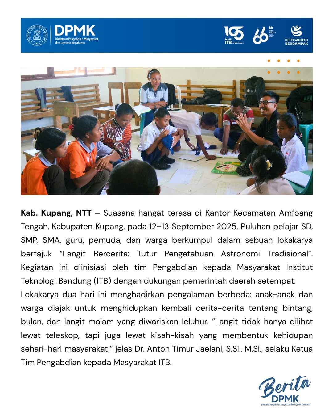 Kupang Regency, NTT – A warm atmosphere was felt at the Central Amfoang District Office, Kupang Regency, on September 12–13, 2025. Dozens of elementary, middle, and high school students, teachers, young people, and residents gathered for a workshop titled "Telling Skies: Traditional Astronomical Knowledge Narratives." This activity was initiated by the Community Service team of the Bandung Institute of Technology (ITB) with the support of the local government.