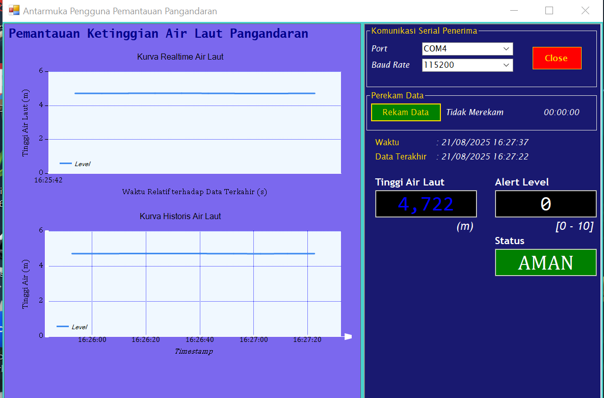 Salah satu materi yang diberikan pada kegiatan tersebut adalah instrumen monitoring ketinggian air laut yang dapat digunakan sebagai peringatan dini tsunami. Alat pemantauan ketinggian air laut yang dikembangkan oleh Kelompok Keahlian Fisika FIK dengan diketuai Dr. Irfan Dwi ini merupakan inovasi sederhana namun efektif untuk mendeteksi potensi tsunami secara dini, terinspirasi dari model deteksi tsunami berbasis pengukuran level laut dalam penelitian Alessandro Annunziato tahun 2022. Menggunakan perangkat keras seperti ESP 32 yang terjangkau dan receiver yang terhubung via kabel USB ke PC Windows, alat ini memantau perubahan level air laut secara real-time melalui sensor yang dipasang di wilayah pesisir, menampilkan data dalam bentuk grafik kurva terkini dan historis pada antarmuka pengguna (user interface) yang mudah dioperasikan. Saat kondisi normal maka antarmuka pada layar PC akan menunjukkan status "AMAN" serta tingkat peringatan 0, sistem ini memastikan tidak ada anomali. Namun, algoritma cerdasnya—yang membandingkan prakiraan jangka pendek dan panjang level air sesuai panduan penggunaan—akan mendeteksi gelombang tidak normal, seperti yang disebabkan oleh gempa, longsor, atau letusan gunung berapi, sehingga mengirimkan peringatan untuk memungkinkan evakuasi cepat.