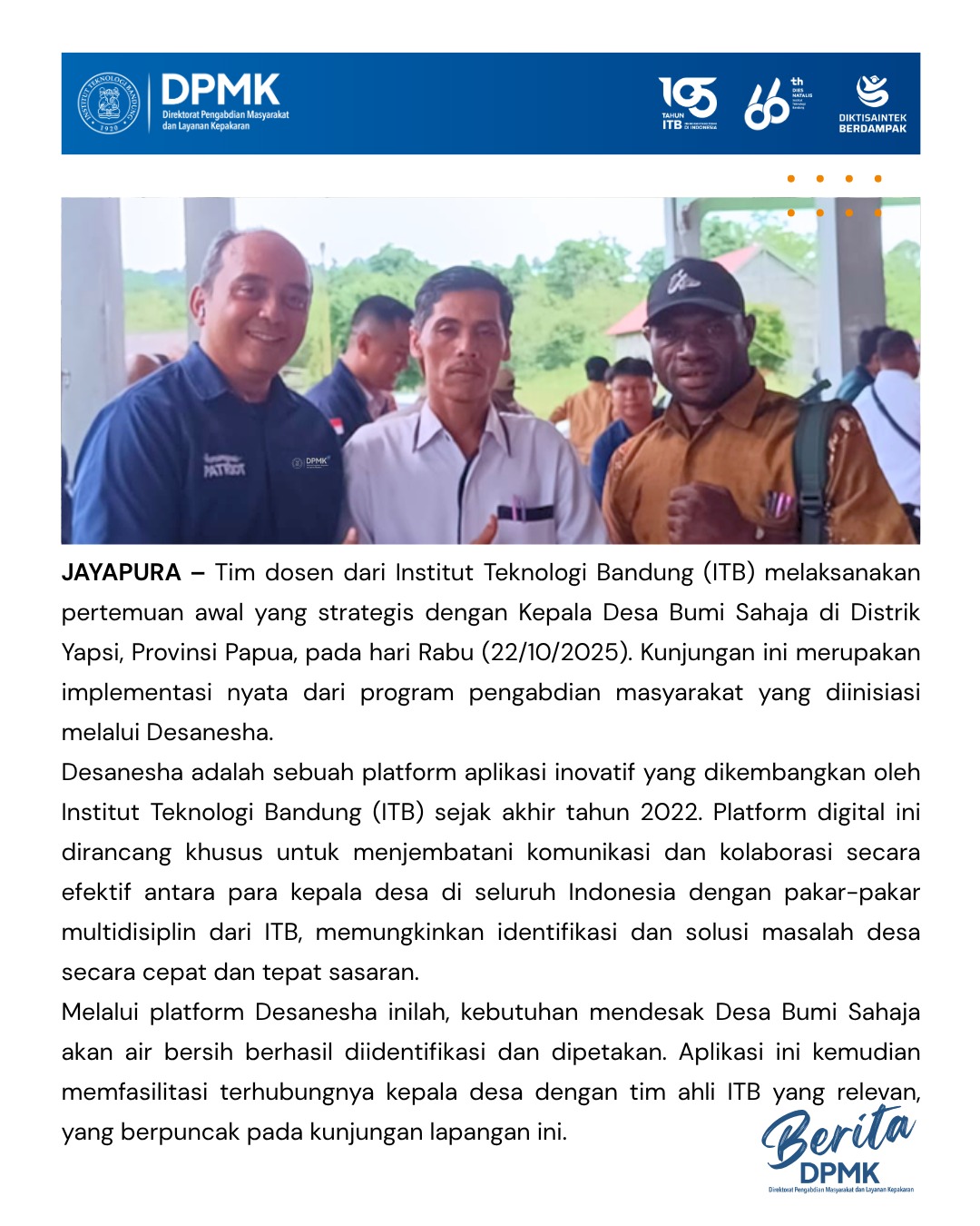 Kegiatan di Desa Bumi Sahaja ini menegaskan komitmen ITB dalam pemberdayaan masyarakat melalui penerapan teknologi tepat guna. Platform Desanesha, sebagai inovasi digital ITB yang telah dikembangkan sejak 2022, terbukti menjadi jembatan efektif untuk membangun solusi berkelanjutan terhadap permasalahan riil di lapangan, sekaligus memperkuat sinergi antara akademisi, pemerintah, dan masyarakat untuk membangun Papua yang lebih mandiri dan sejahtera.