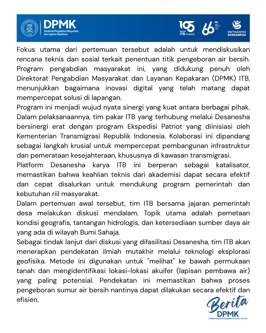 Platform Desanesha karya ITB ini berperan sebagai katalisator, memastikan bahwa keahlian teknis dari akademisi dapat secara efektif dan cepat disalurkan untuk mendukung program pemerintah dan kebutuhan riil masyarakat.