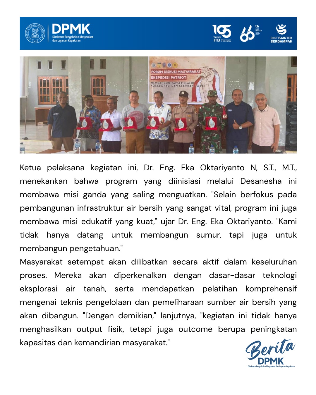 Ketua pelaksana kegiatan ini, Dr. Eng. Eka Oktariyanto N, S.T., M.T., menekankan bahwa program yang diinisiasi melalui Desanesha ini membawa misi ganda yang saling menguatkan. "Selain berfokus pada pembangunan infrastruktur air bersih yang sangat vital, program ini juga membawa misi edukatif yang kuat," ujar Dr. Eng. Eka Oktariyanto. "Kami tidak hanya datang untuk membangun sumur, tapi juga untuk membangun pengetahuan."