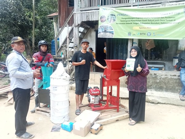Selain teknologi BSF, ITB dan UBT memberikan pelatihan pembuatan pakan alternatif untuk budidaya ikan lele dengan memanfaatkan bahan-bahan yang tersedia di lingkungan sekitar. Pakan alternatif ini menjadi solusi mendesak mengingat harga pelet komersial di wilayah perbatasan relatif mahal. Untuk memastikan keberlanjutan produksi pakan lokal, tim pengabdian juga menyerahkan bantuan berupa mesin pelet dan mesin pencacah kepada kelompok tani. Peralatan ini memungkinkan masyarakat memproduksi pakan dalam kapasitas yang memadai untuk kebutuhan budidaya.