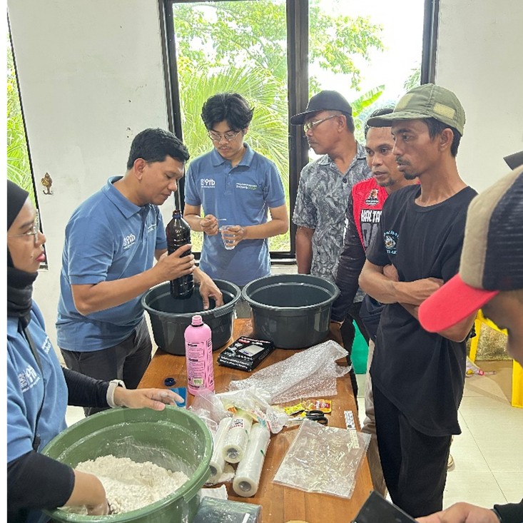 Kegiatan ini melibatkan tim lintas disiplin dari ITB dan mitra universitas, di antaranya, Prof. Ir. Ramadhani Eka Putra, M.Si., Ph.D, Dr. Indra Wibowo dan Bayani Nur Azmani, S.Si., M.Si. dari SITH ITB yang berfokus pada teknologi biokonversi dan pengelolaan lingkungan, Indria Herman, S.T., M.T., Ph.D. dari Fakultas Teknik Mesin dan Dirgantara (FTMD) ITB yang memberikan penjelasan mengenai desain dan mekanisme mesin pertanian, serta Deny Willy Junaidy, S.Sn., M.T., Ph.D. dari Fakultas Seni Rupa dan Desain (FSRD) ITB yang berkontribusi pada pembuatan desain modul kreatif untuk edukasi masyarakat. Dari pihak mitra, Dr. Ida Kinasih dari Fakultas Biologi UIN Bandung memberikan pelatihan pertanian pekarangan menggunakan raised bed sederhana dan pengolahan pangan bergizi berbahan dasar lokal, sementara dari Fakultas Perikanan dan Kelautan UBT, Dr. Awaludin dan Kartina, M.Sc. memberikan penjelasan terkait formulasi pakan alternatif untuk budidaya ikan lele berbasis bahan lokal.
