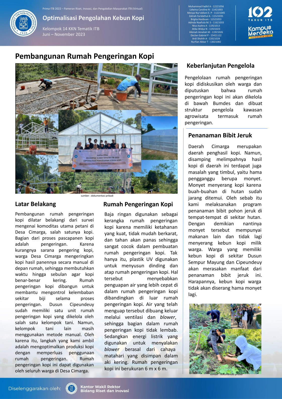 Rumah pengeringan kopi ini, berukuran 6m x 6m, dibangun dengan menggunakan baja ringan untuk kerangka yang kuat dan tahan lama, serta plastik UV untuk dinding dan atap yang mempercepat proses pengeringan. Sistem ventilasi dan blower di dalam rumah memastikan kelembaban terkontrol dan kopi bisa kering dengan cepat. Sementara itu, energi listrik untuk blower berasal dari panel surya, menandai pendekatan ramah lingkungan dalam proyek ini.