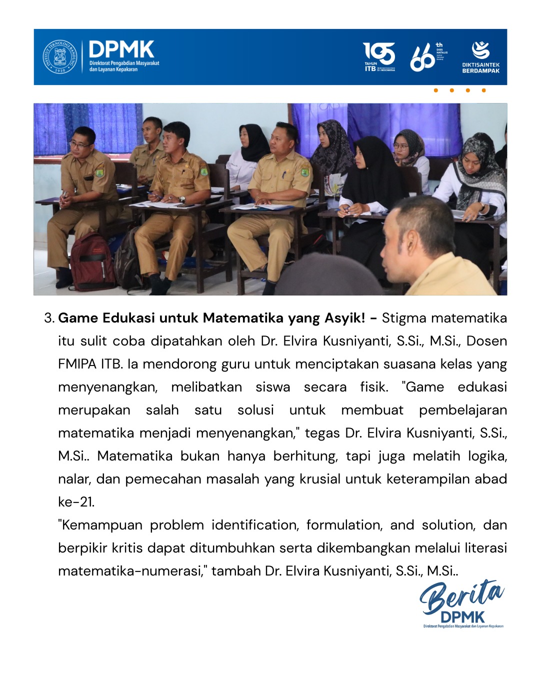 "Kemampuan problem identification, formulation, and solution, dan berpikir kritis dapat ditumbuhkan serta dikembangkan melalui literasi matematika-numerasi," tambah Dr. Elvira Kusniyanti, S.Si., M.Si..