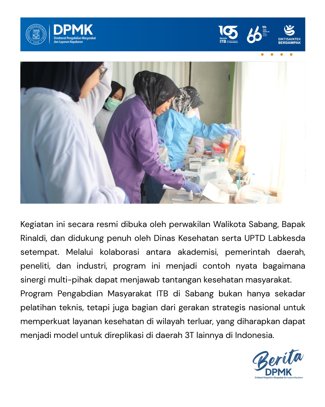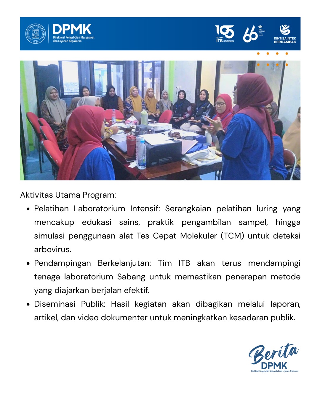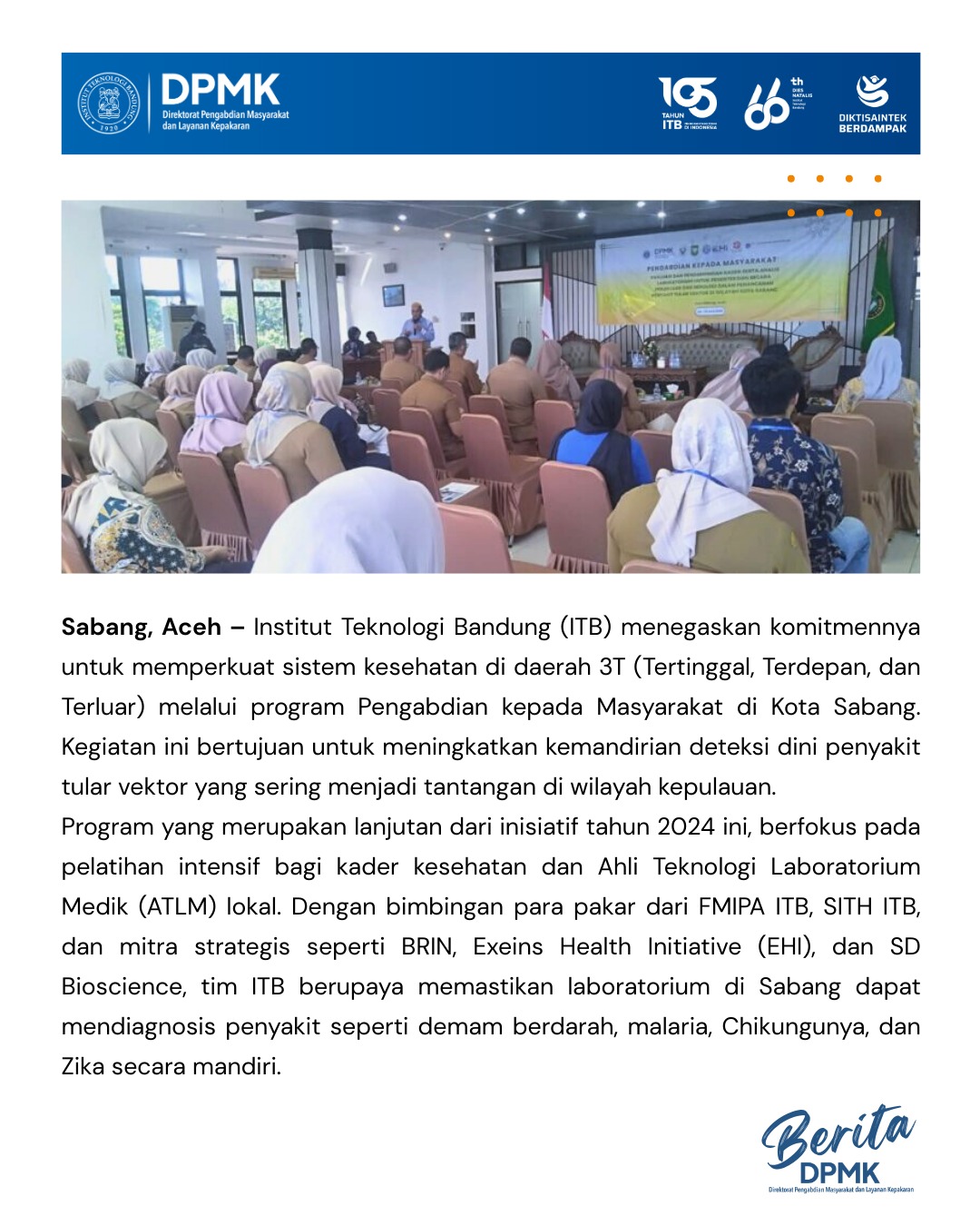 Program yang merupakan lanjutan dari inisiatif tahun 2024. Pada tahun pertama, kegiatan difokuskan pada workshop deteksi molekular Plasmodium knowlesi bagi tenaga kesehatan, dilanjutkan pengumpulan lebih dari 350 sampel darah selama satu tahun penuh untuk mengkaji hubungan kejadian infeksi P. knowlesi dengan pola cuaca. Hasil penelitian ini dijadikan skripsi pada Pogram Studi Sarjana Kimia, FMIPA , ITB dan menghasilkan rekomendasi bagi Dinas Kesehatan Sabang bahwa peningkatan infeksi terjadi saat peralihan musim hujan ke kemarau. Bukti ini menunjukkan sinergi antara kegiatan Pengabdian kepada Masyarakat dan penelitian dalam memberi solusi berbasis data bagi kebijakan daerah. Kegiatan Pengabdian kepada Masyarakat pada tahun 2025 berfokus pada pelatihan intensif bagi kader kesehatan dan Ahli Teknologi Laboratorium Medik (ATLM) lokal untuk diagnosis secara molekular penyakit tular vektor seperti demam berdarah, malaria, Chikungunya, Yellow fever dan Zika. Dengan bimbingan para pakar dari FMIPA ITB (Dr.rer.nat Fifi Fitriyah Masduki) , SITH ITB (Dr. Indra Wibowo), dan mitra strategis seperti Pusat Riset Biologi Molekuler Eijkman BRIN ( Rintis Noviyanti, PhD; Dr. Leily Trianty, Tedjo Sasmono, Ph.D; Dr.sci.hum. Ari W Satyanagraha), Exeins Health Initiative (Ritya Amalia, Fahira Ainun Nisa, Marsha Sinditia, Bunga Rana), dan SD Bioscience, tim tersebut berupaya memastikan laboratorium di Sabang dapat mendiagnosis penyakit tular vektor tersebut secara mandiri.