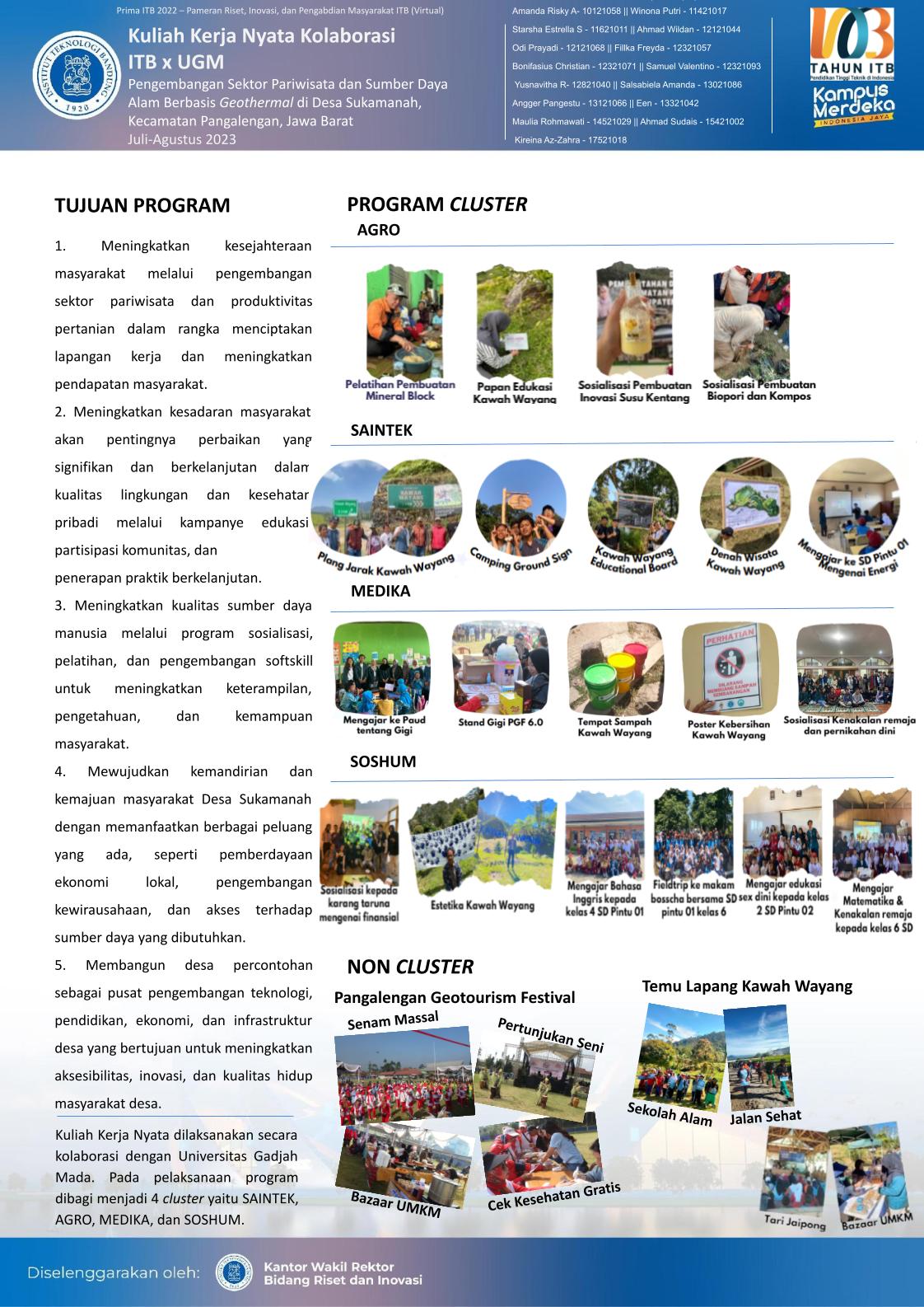 Dalam upaya mengatasi kendala-kendala tersebut, program KKN-Kolaborasi ITB dan UGM 2023 menginisiasi beberapa program kerja yang dikelompokkan berdasarkan cluster, yaitu Saintek, Medika, Agro, dan Soshum. Setiap cluster memiliki fokus program kerja untuk menyelesaikan permasalahan berdasarkan cluster tersebut. Tujuan utamanya adalah mengembangkan sektor pariwisata dan sumber daya alam berbasis geothermal.