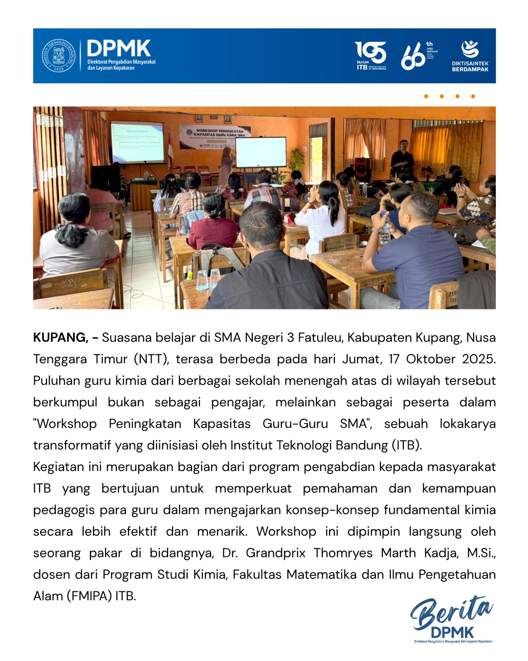 KUPANG, - Suasana belajar di SMA Negeri 3 Fatuleu, Kabupaten Kupang, Nusa Tenggara Timur (NTT), terasa berbeda pada hari Jumat, 17 Oktober 2025. Puluhan guru kimia dari berbagai sekolah menengah atas di wilayah tersebut berkumpul bukan sebagai pengajar, melainkan sebagai peserta dalam "Workshop Peningkatan Kapasitas Guru-Guru SMA", sebuah lokakarya transformatif yang diinisiasi oleh Institut Teknologi Bandung (ITB).