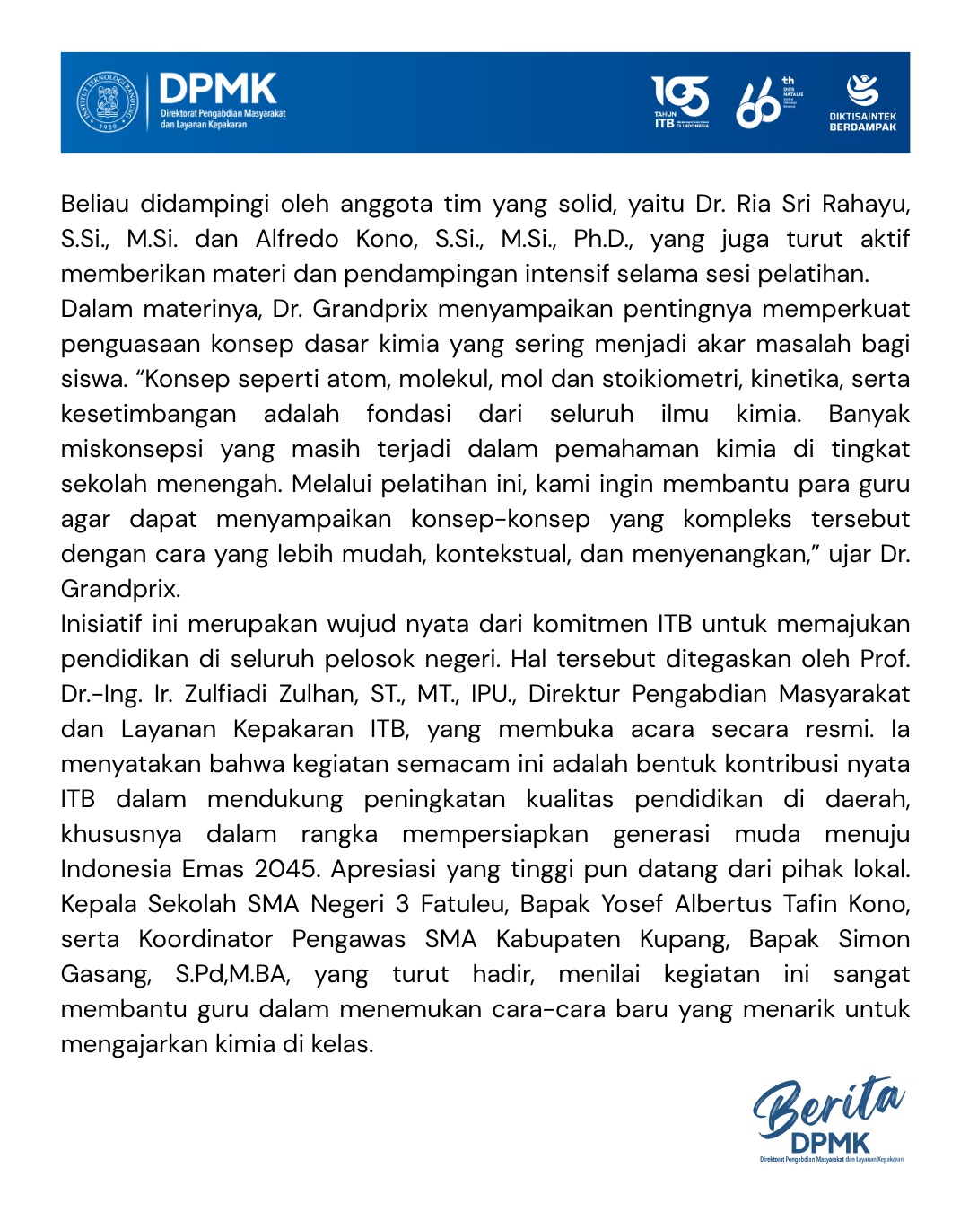 Inisiatif ini merupakan wujud nyata dari komitmen ITB untuk memajukan pendidikan di seluruh pelosok negeri. Hal tersebut ditegaskan oleh Prof. Dr.-Ing. Ir. Zulfiadi Zulhan, ST., MT., IPU., Direktur Pengabdian Masyarakat dan Layanan Kepakaran ITB, yang membuka acara secara resmi. Ia menyatakan bahwa kegiatan semacam ini adalah bentuk kontribusi nyata ITB dalam mendukung peningkatan kualitas pendidikan di daerah, khususnya dalam rangka mempersiapkan generasi muda menuju Indonesia Emas 2045. Apresiasi yang tinggi pun datang dari pihak lokal. Kepala Sekolah SMA Negeri 3 Fatuleu, Bapak Yosef Albertus Tafin Kono, serta Koordinator Pengawas SMA Kabupaten Kupang, Bapak Simon Gasang, S.Pd,M.BA, yang turut hadir, menilai kegiatan ini sangat membantu guru dalam menemukan cara-cara baru yang menarik untuk mengajarkan kimia di kelas.