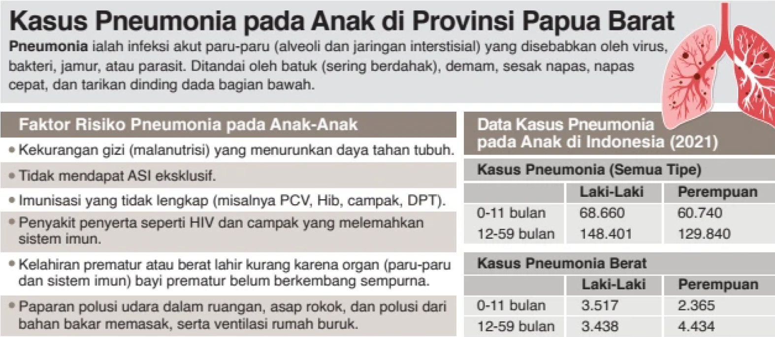 Khusus di Provinsi Papua Barat, angka perkiraan kasus pneumonia secara dalah sebanyak 2.937 kasus pneumonia balita dengan persentase penemuan penderita pneumonia pada Balita adalah 36,2%. Oleh karena itu, sampai saat ini program dalam pengendalian pneumonia lebih di prioritaskan pada pengendalian pneumonia balita.