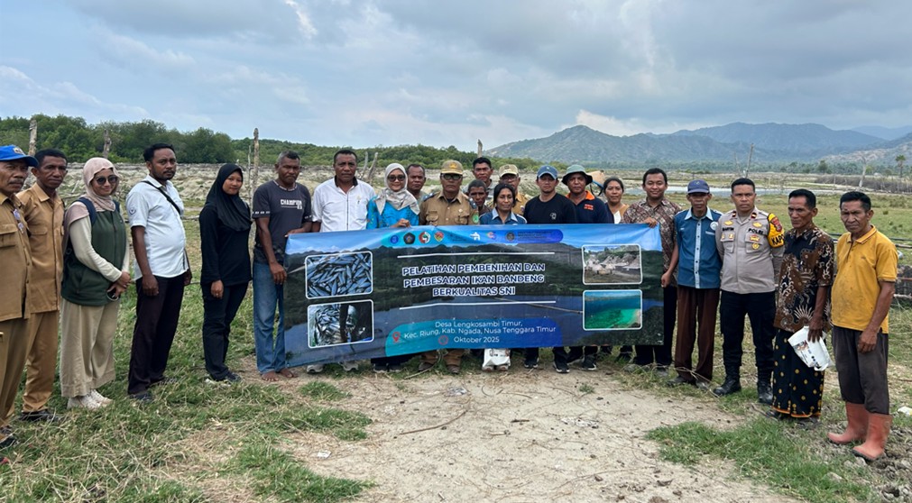 “Di Kabupaten Ngada, Lengkosambi Timur itu satu-satunya desa yang ada bandeng bapak. Ada tambak bandeng itu baru sekitar tahun 2017-an dan masyarakat yang menjadi petambak belajar mandiri” Wilbrordus Siga, S.E. menyampaikan situasi petambak kepada tim PM saat pelatihan berlangsung di lokasi tambak. Tim PM sebelum memulai pelatihan di tanggal 27 Oktober 2025, satu hari sebelumnya sudah berkeliling melakukan survei kepada stakeholder lokal dan juga pemegang kebijakan antara lain petani tambak, Camat Riung, Kapolsek Riung, Dinas Perikanan Kabupaten Ngada, Anggota DPRD Ngada Komisi IV, dan juga Wakil Bupati Ngada. Hasil dari diskusi terpisah tersebut memberi informasi yang serupa kepada tim PM bahwa masalah utama dari budidaya yang dilakukan oleh kelompok masyarakat adalah minimnya tingkat literasi budidaya bandeng yang baik dan fasilitas penunjang yang kurang, seperti teknologi pembuatan pangan dan kolam budidaya untuk pembesaran nener.