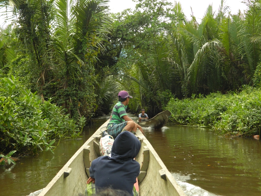 Setelah beristirahat satu malam, rombongan barulah merasakan sensasi perjalanan tak biasa keesokan harinya. Bukan lagi kapal atau perahu, namun menggunakan sampan. Lebih menegangkan lagi, sampannya berukuran kecil selebar satu orang duduk, kapasitasnya 2 orang penumpang per sampan (termasuk bawaan perlengkapan pribadi). Perjalanan ditempuh dalam waktu 2-3 jam dengan kondisi terjemur cukup melelahkan, setiap gerakan tubuh membuat perahu bergoyang tak seimbang.