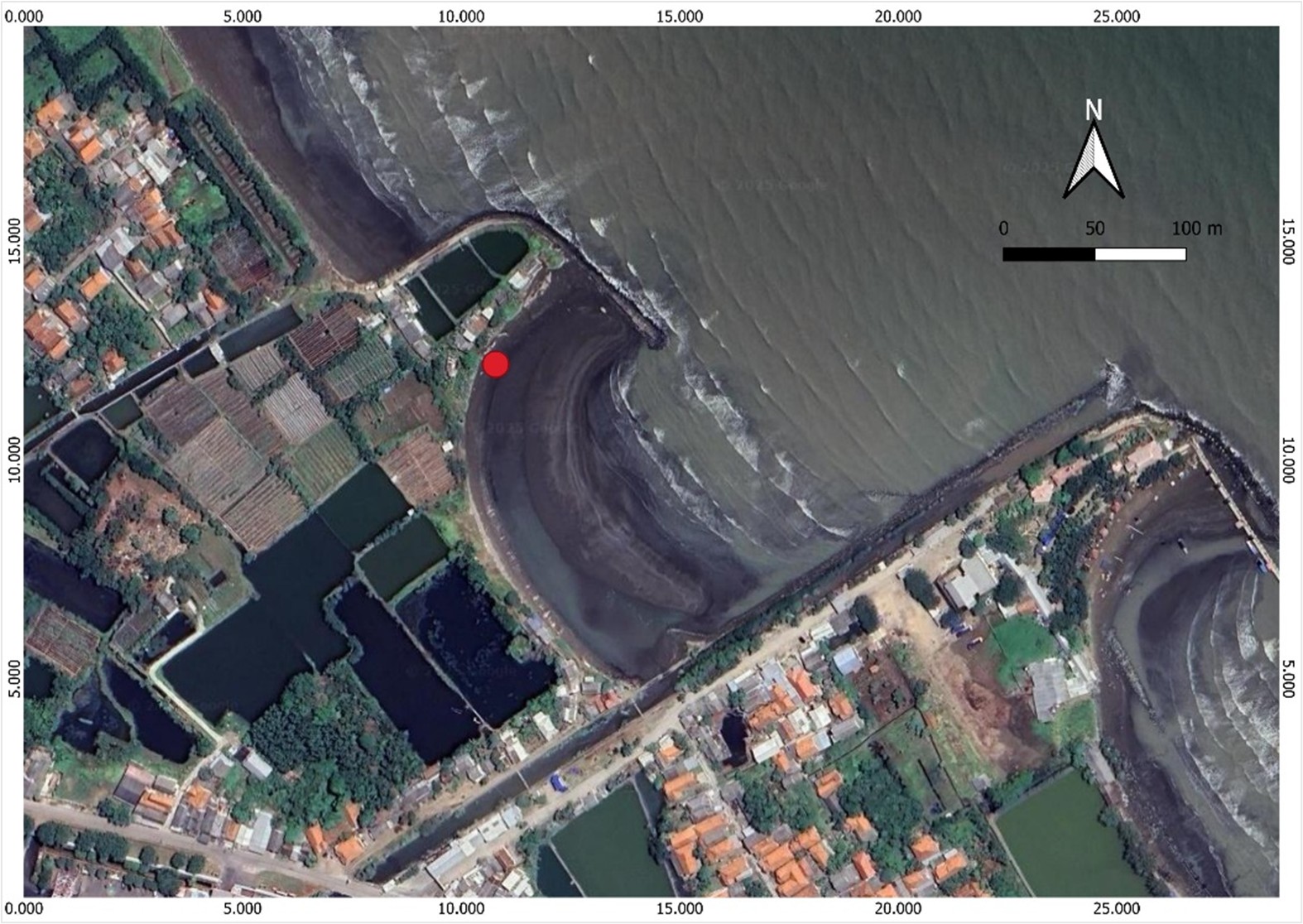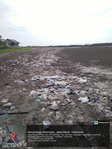 Pesisir Laut Moi-moi berlokasi di Balongan, Indramayu (6°21'22,72" LS; 108°23'5,41" BT), diapit oleh dua wisata bahari yaitu Pantai Bali Indah di sebelah Timur dan Pantai Tirta Ayu di sebelah Barat. Di sepanjang pesisir ini terdapat pemukiman warga Desa Balongan dan kawasan PT. Pertamina RU VI. Gambar 1 menunjukkan lokasi Pesisir Laut Moi-moi. Kajian sanitasi yang dilakukan di pantai ini didasarkan pada pertimbangan karena dekat dengan aktivitas pemukiman, pariwisata dan kilang minyak. Sanitasi dilakukan untuk menentukan jumlah dan jenis sampah yang terdapat di lingkungan Pesisir Laut Moi-moi. Sehingga dapat memberikan gambaran dampak aktivitas antropogenik terhadap kelestarian ekosistem pantai.