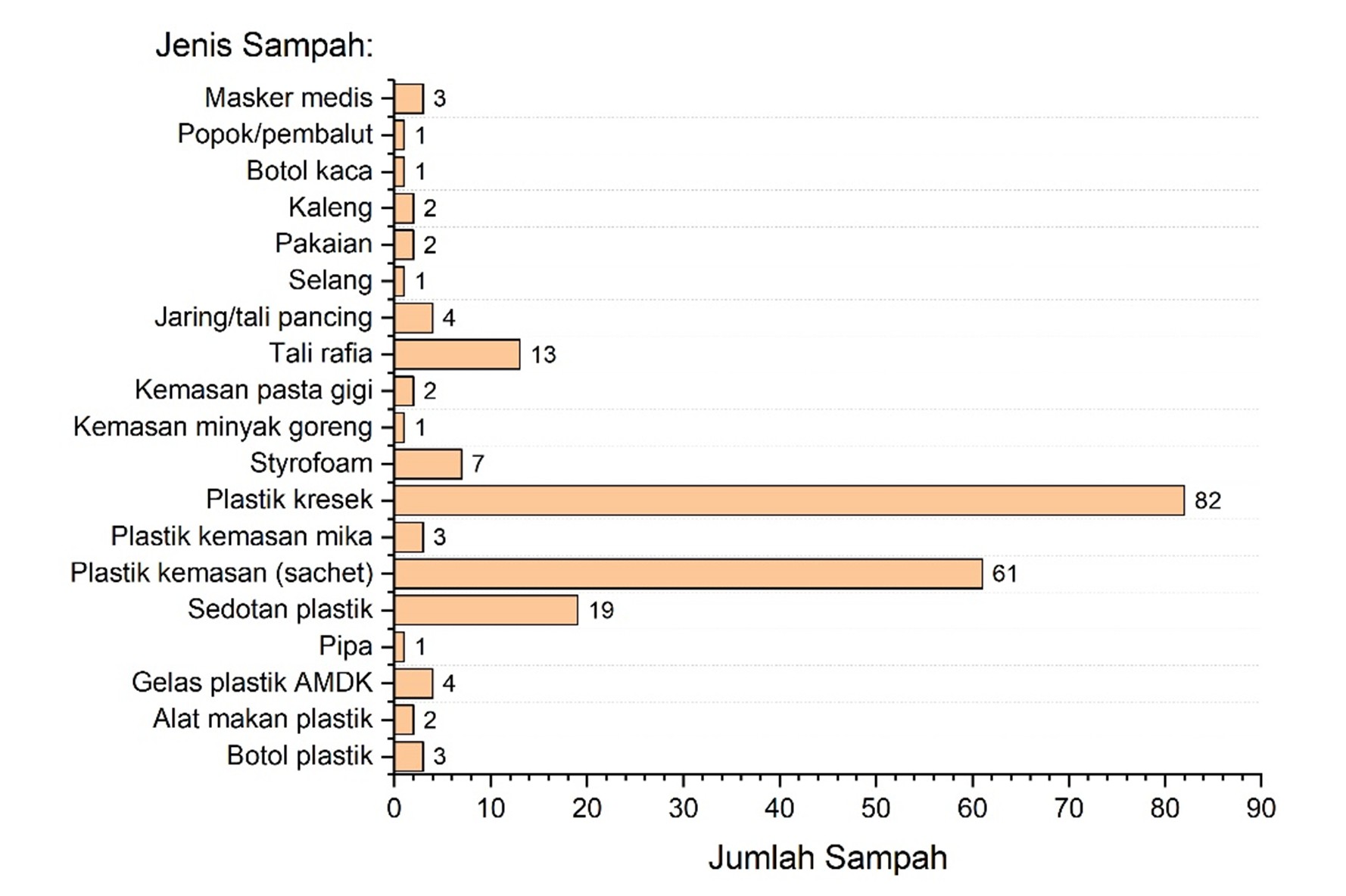 Kajian sanitasi dilakukan pada 12 Mei 2025, menggunakan metode transek 10 meter sepanjang garis pasang tertinggi, dengan area pembersihan seluas 3 x 10 m2. Sampah yang diambil hanya yang berada di atas permukaan tanah saja. Hasilnya menunjukkan bahwa pada area tersebut, terdapat total sampah seberat 8,295 kg berat basah, yang mana didominasi jenis sampah plastik sekali pakai seperti plastik kresek dan kemasan. Gambar 2 menunjukkan jenis-jenis sampah yang ditemukan di area kajian di Pesisir Laut Moi-moi. Selain plastik, ditemukan juga sampah kain, kaca dan B3 seperti masker, popok dan pembalut. Sampah-sampah plastik n parah dapat terjadi seiring berjalannya waktu.