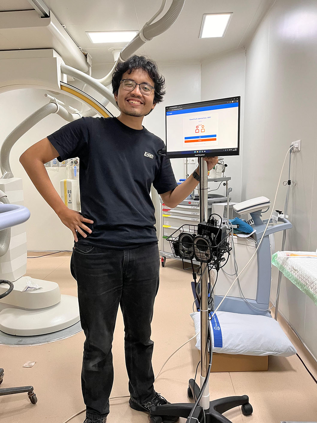 Sebelum alat diimplementasikan, tim melakukan survei langsung ke lokasi pemasangan, yaitu ruang cath lab RSUD Undata Palu. Survei tersebut penting untuk memastikan alat yang dikembangkan dapat terintegrasi dengan baik ke sistem dan peralatan medis yang sudah ada di rumah sakit. Selain itu, tim juga melakukan wawancara mendalam dengan para pengguna utama alat ini. Pihak proctor diwakili oleh dr. Muhammad Kusdiansah, Sp.BS dari RS PON Jakarta, sementara pihak proctee adalah dr. Franklin Lessyamana Sinanu, Sp.BS dari RSUD Undata Palu. Wawancara ini memberikan banyak masukan berharga mengenai kebutuhan nyata di lapangan, termasuk harapan pengguna terhadap fungsi, kemudahan, dan keamanan alat.
