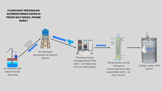 Sayangnya, kesempatan tersebut belum termanfaatkan secara maksimal karena keterbatasan infrastruktur penunjang seperti pengolahan air minum di tempat publik yang dapat diakses oleh tidak hanya masyarakat tapi juga pengunjung pariwisata. Oleh karena itu, pemasangan alat filtrasi di Pekon Way Redak menjadi titik krusial, bukan hanya sebagai solusi kebutuhan harian warga, tetapi juga sebagai langkah awal pemanfaatan potensi lokal secara berkelanjutan. Program ini membuka kemungkinan pengembangan desa menjadi pusat edukasi air bersih dan konservasi lingkungan berbasis masyarakat.