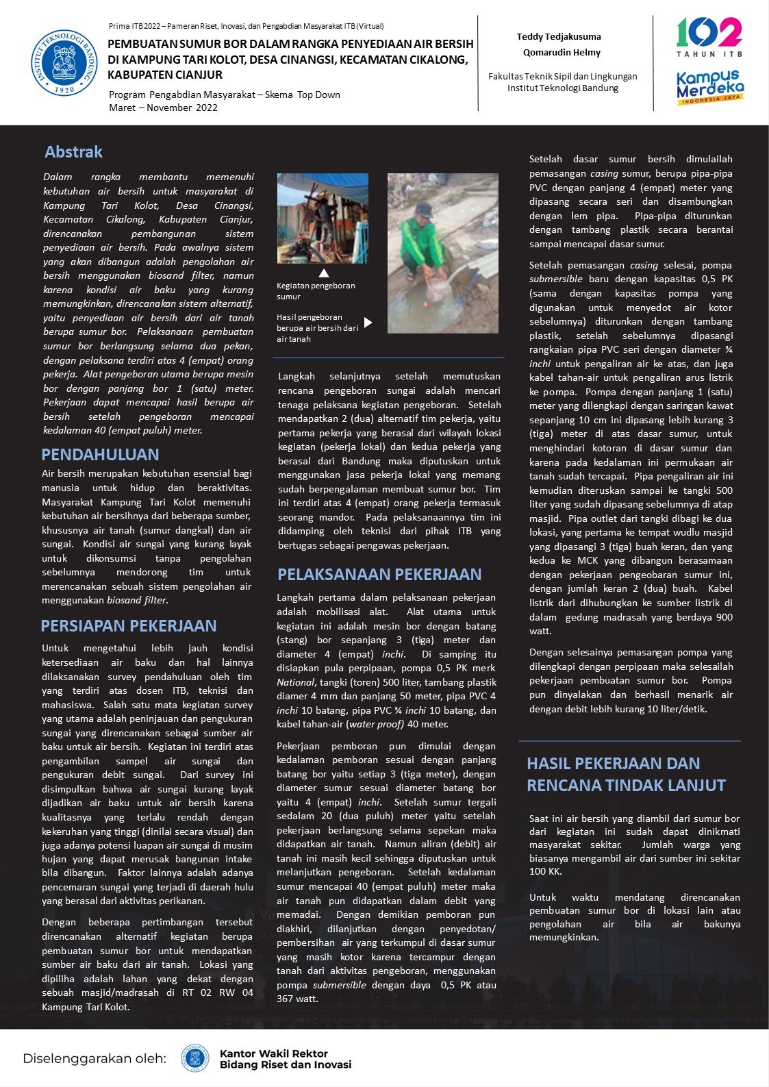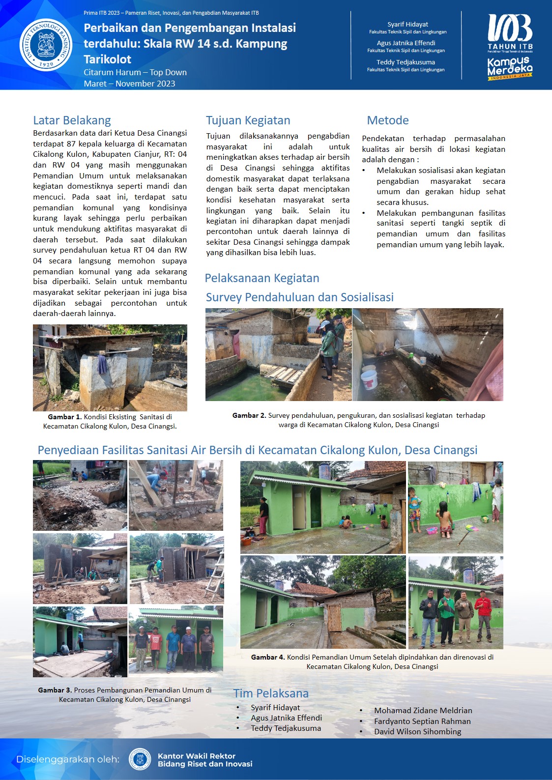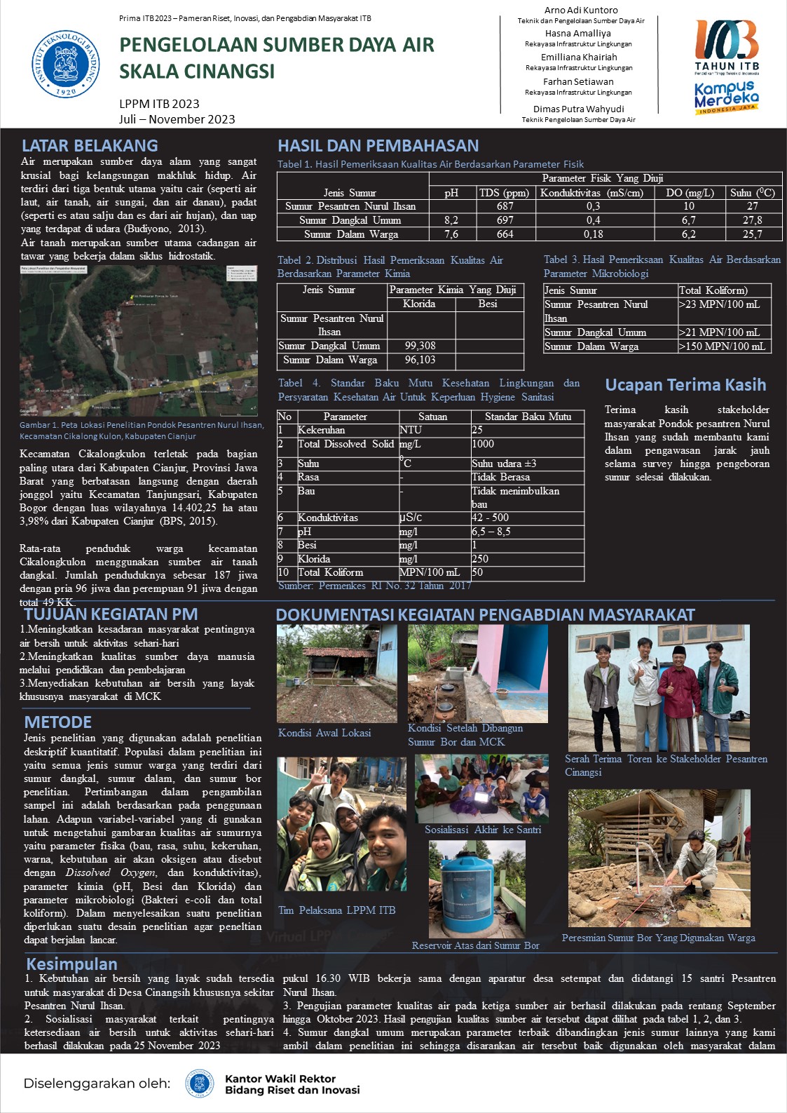Kegiatan Pengabdian Masyarakat dengan tema pengelolaan sumber daya air di Desa Cinangsi, Kecamatan Cikalongkulon Kabupaten Cianjur ini difokuskan pada upaya penyediaan air baku bagi warga di sekitar lokasi Pesantren Nurul Ihsan