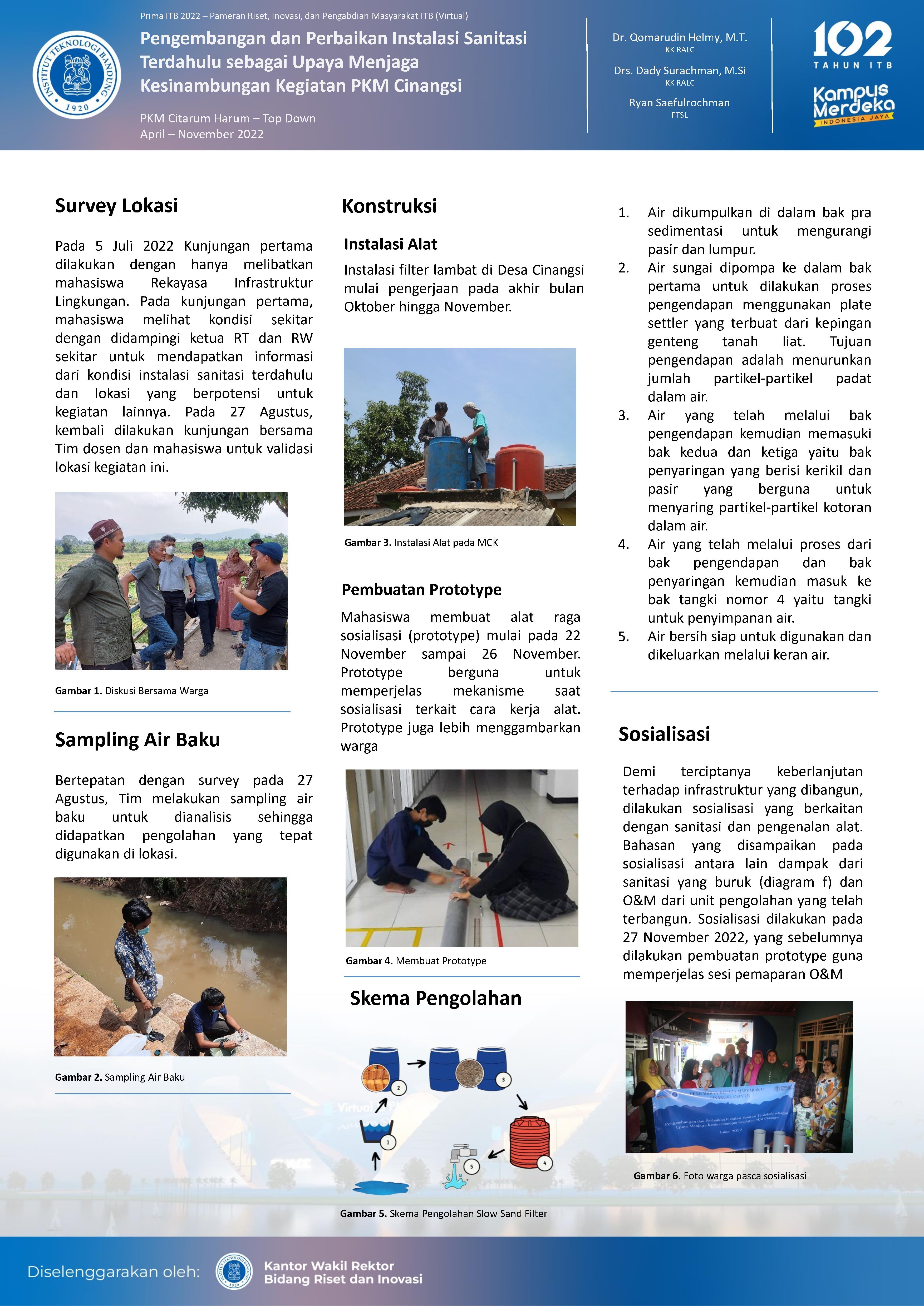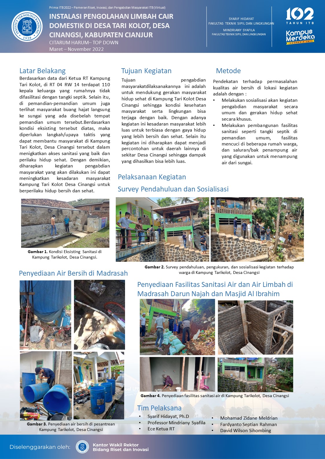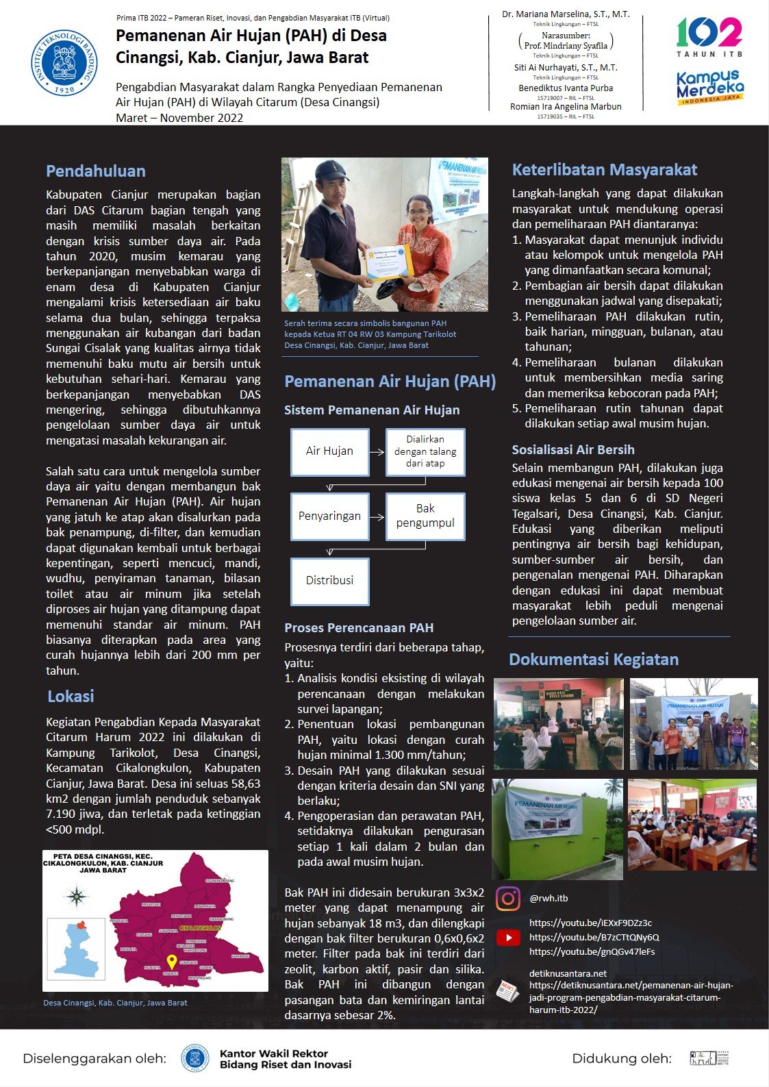 Kegiatan Pengabdian Masyarakat dengan tema pengelolaan sumber daya air di Desa Cinangsi, Kecamatan Cikalongkulon Kabupaten Cianjur ini difokuskan pada upaya penyediaan air baku bagi warga di sekitar lokasi Pesantren Nurul Ihsan