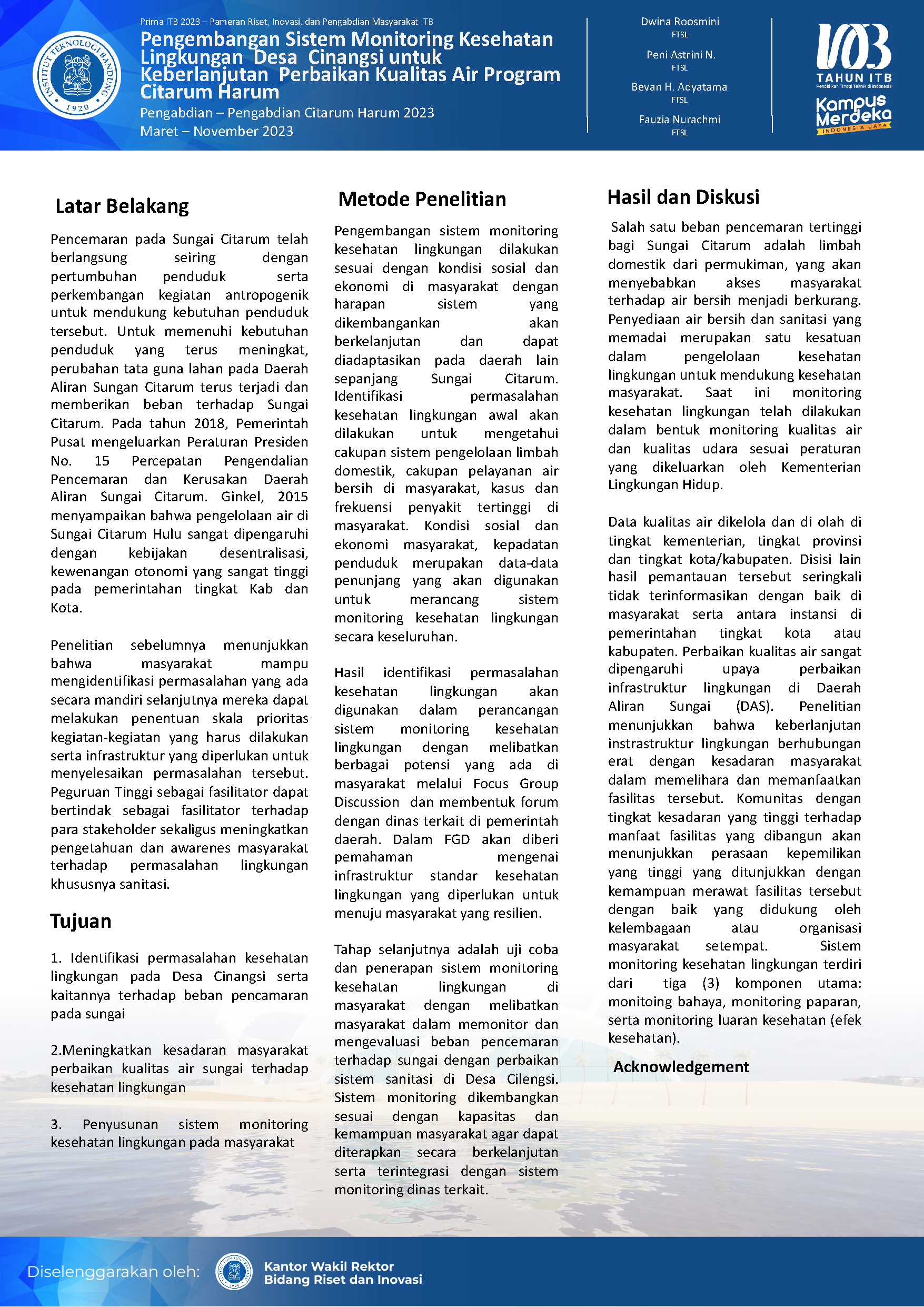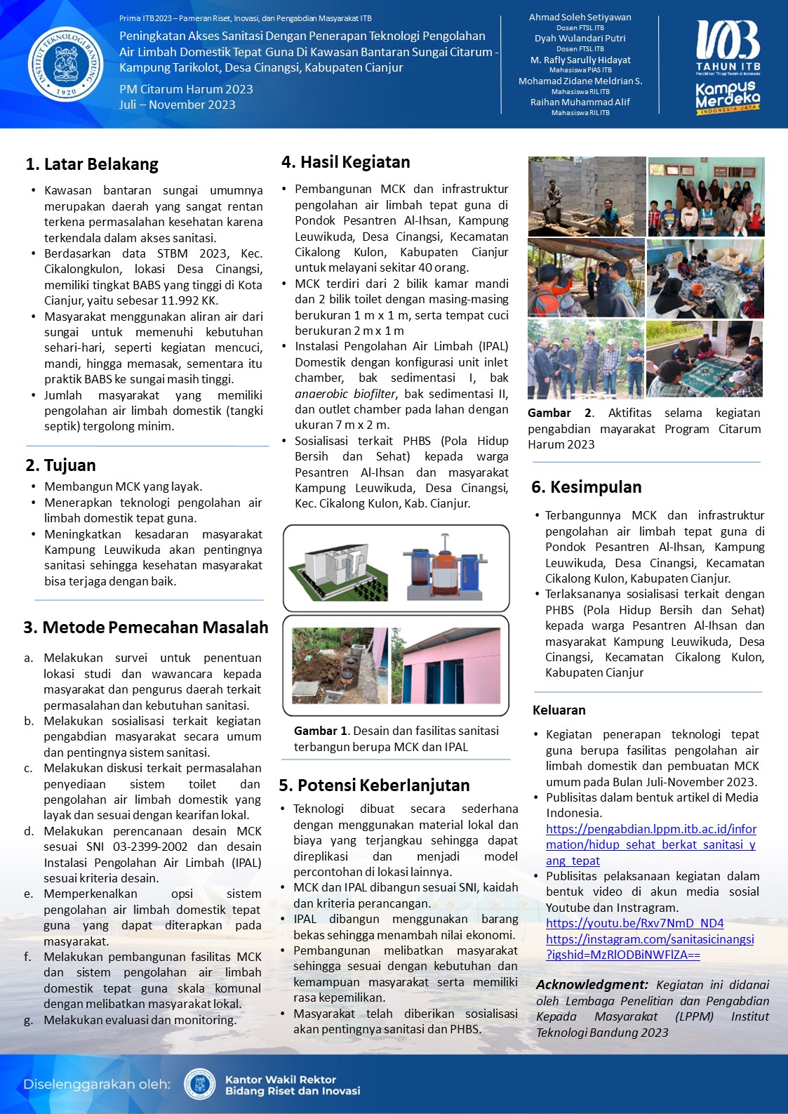 Kegiatan pengabdian kepada masyarakat yang diajukan tahun 2023 ini merupakan kelanjutan dari kegiatan tahun 2018 – 2022 terkait Gerakan masyarakat hidup sehat khususnya masalah sanitasi yang telah dilakukan di Desa Cinangsi, Cianjur.