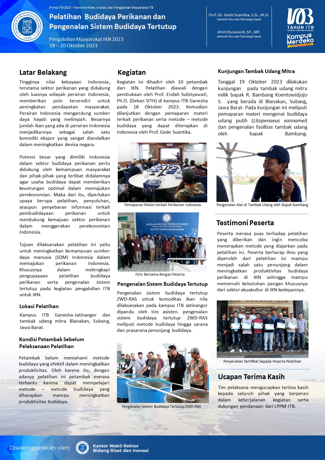 Peserta pelatihan budidaya perikanan melakukan site visit ke Blanakan, Subang untuk berdiskusi dan melihat fasilitas produksi budidaya udang putih di salah satu petambak mitra dari SITH-ITB