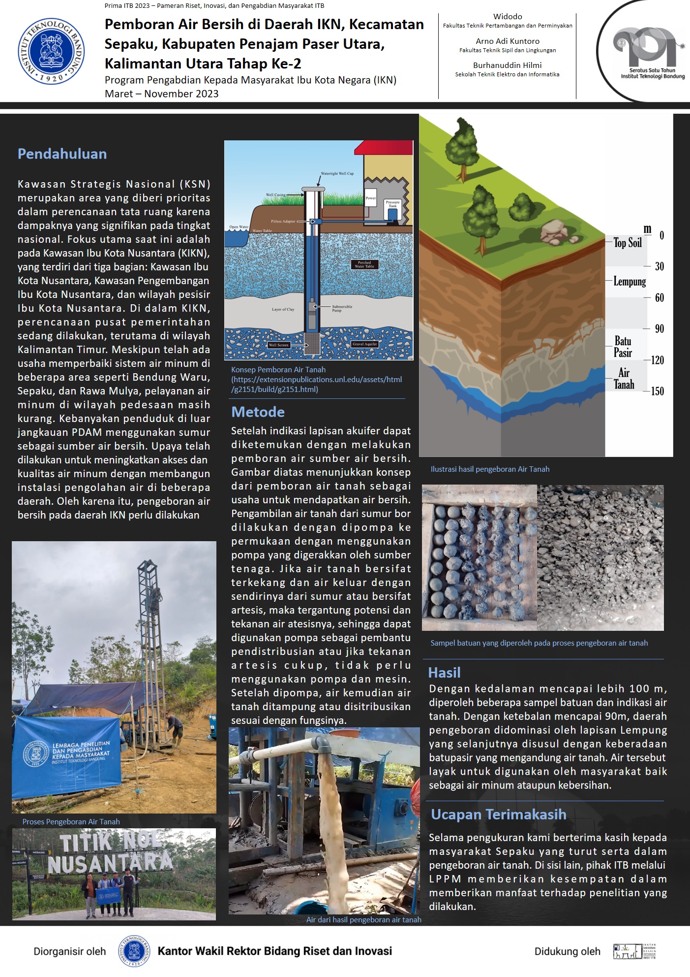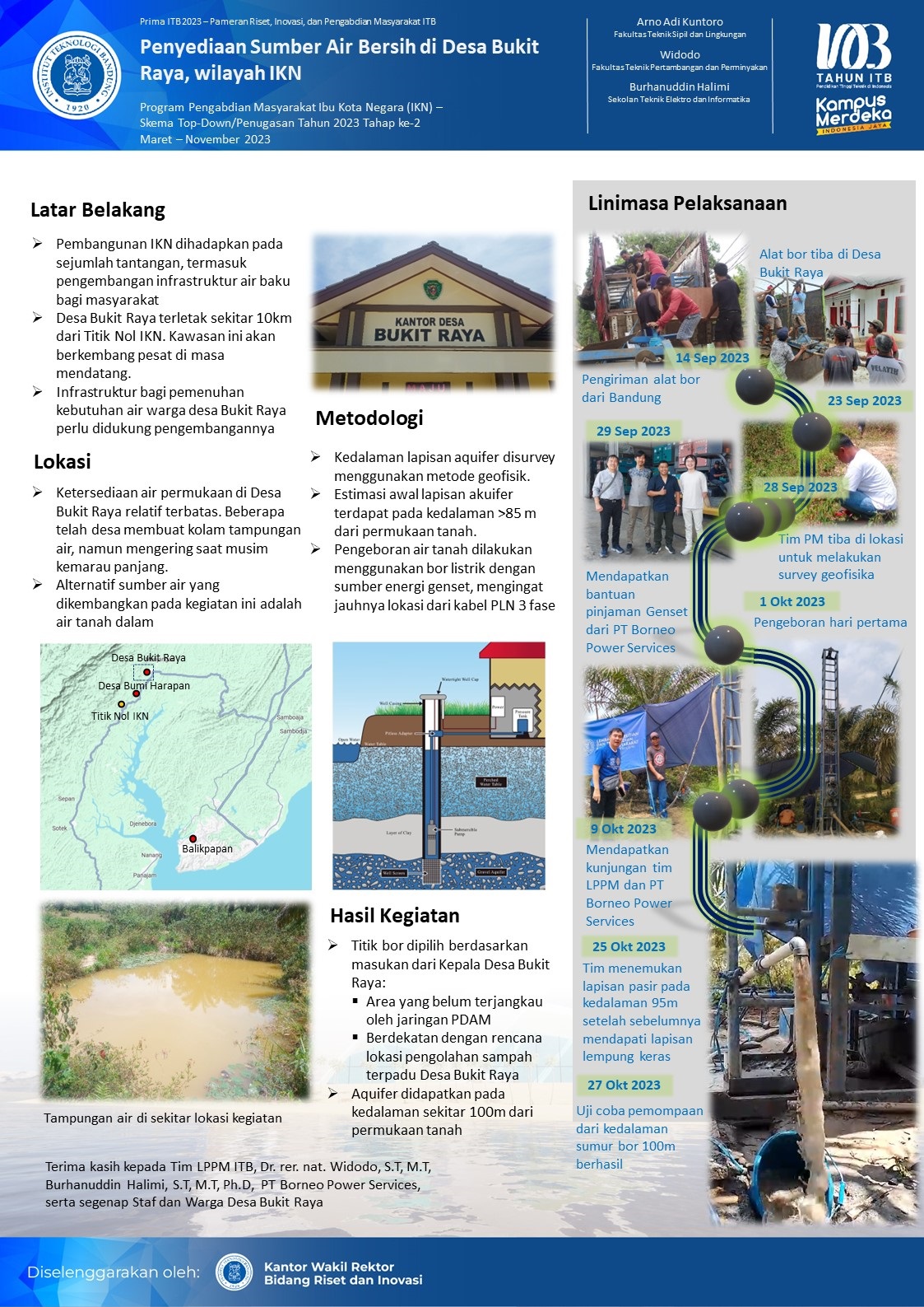 Tim ITB melalui LPPM saat ini tengah menjalankan 14 program pengabdian masyarakat di IKN dengan tiga sasaran utama, yaitu ketahanan pangan melalui pengolahan sumber daya hayati, energi melalui teknologi pengolahan air bersih, dan pengembangan pariwisata lahan bekas tambang