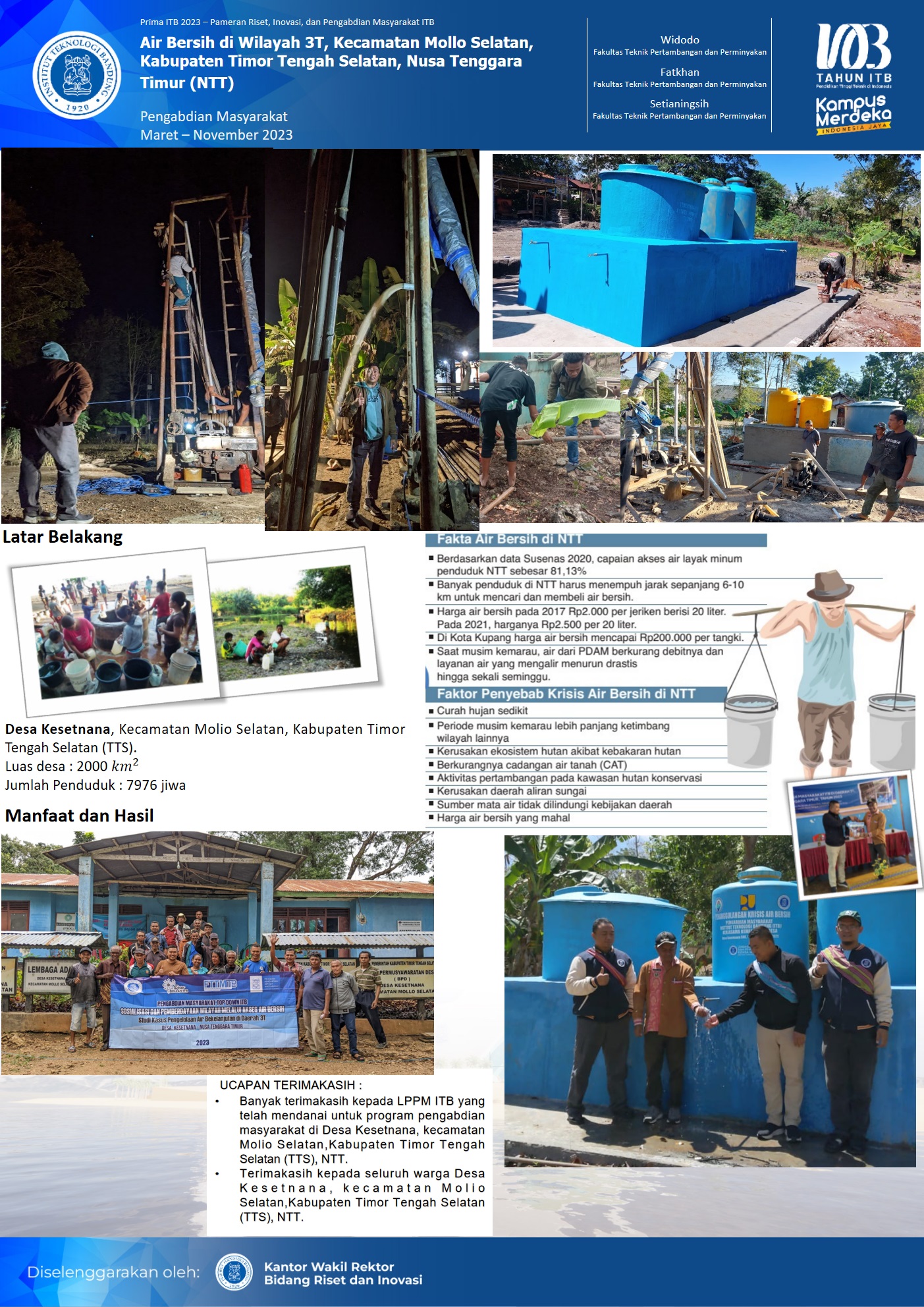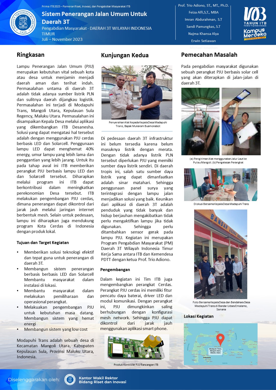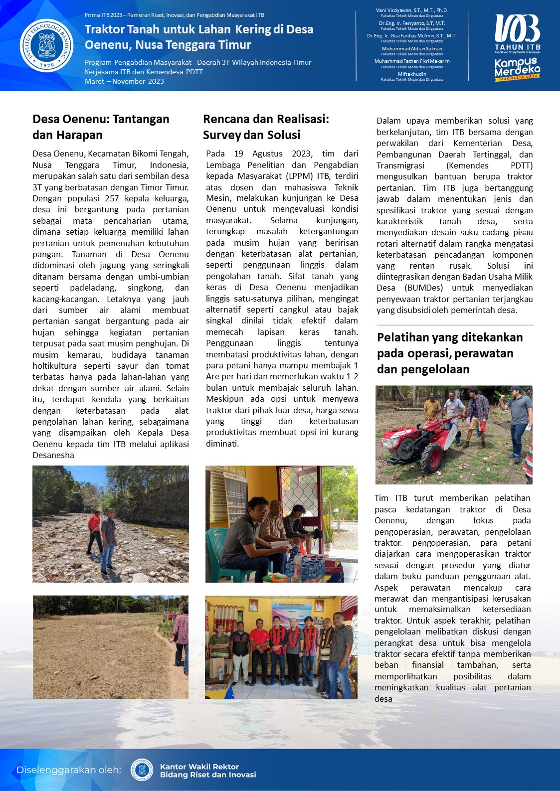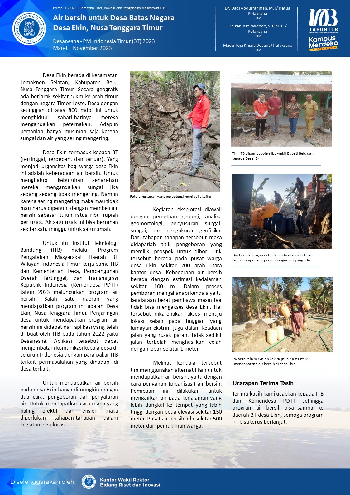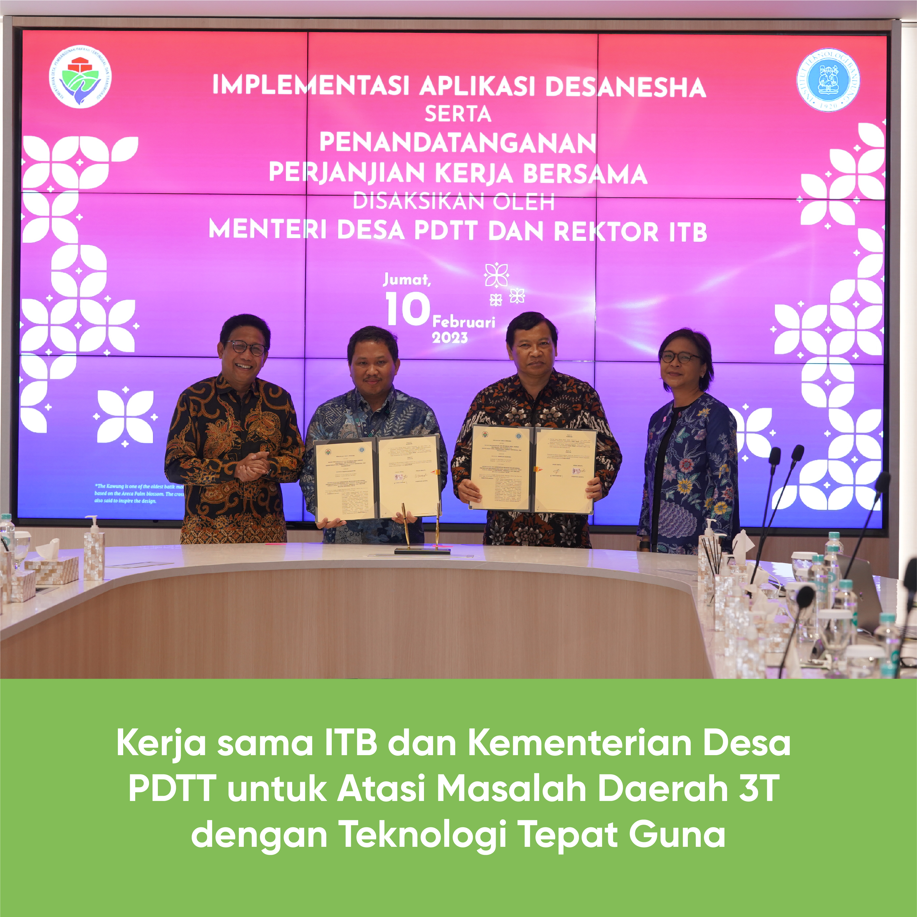 Direktorat Riset dan Pengabdian Masyarakat Institut Teknologi Bandung (DRPM ITB) dengan Kementerian Desa, Pembangunan Daerah Tertinggal dan Transmigrasi (Kemendes PDTT) untuk penerapan teknologi tepat guna di wilayah 3T (tertinggal, terdepan, dan terluar). Sebanyak 30 desa di Nusa Tenggara Timur dan Maluku Utara akan menjadi sasaran. Kategorinya terdiri atas 22 desa tertinggal dan 8 desa sangat tertinggal.