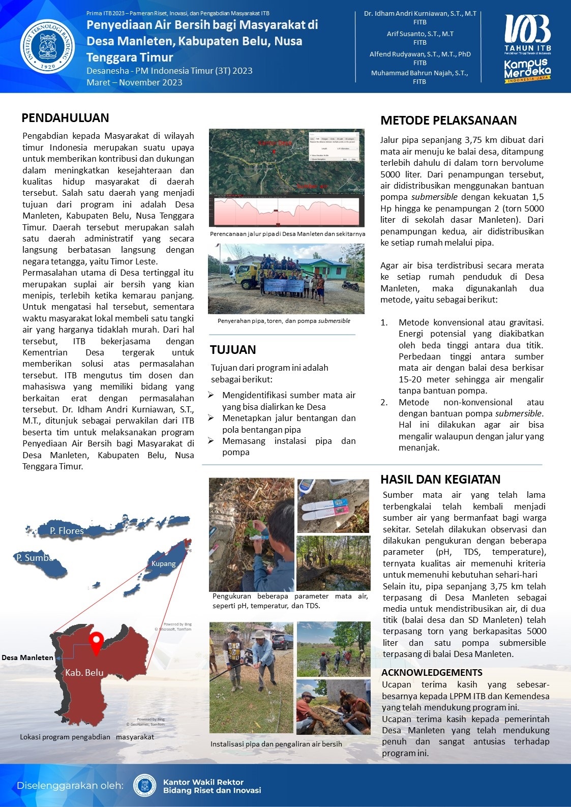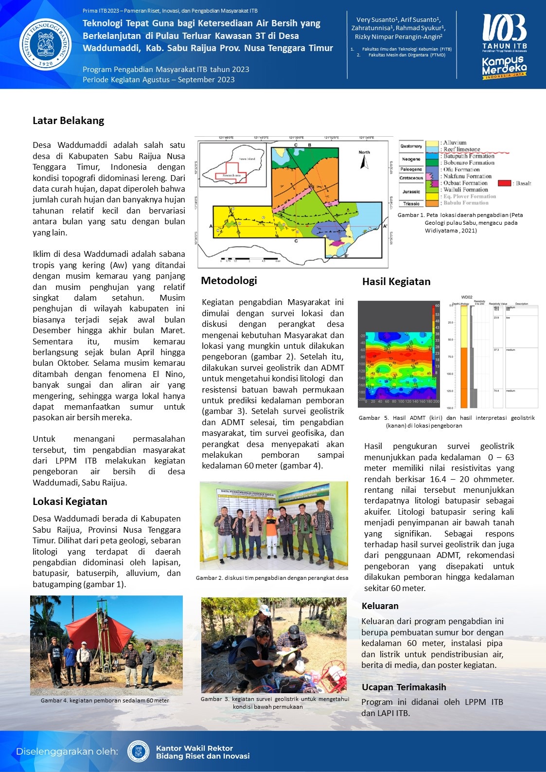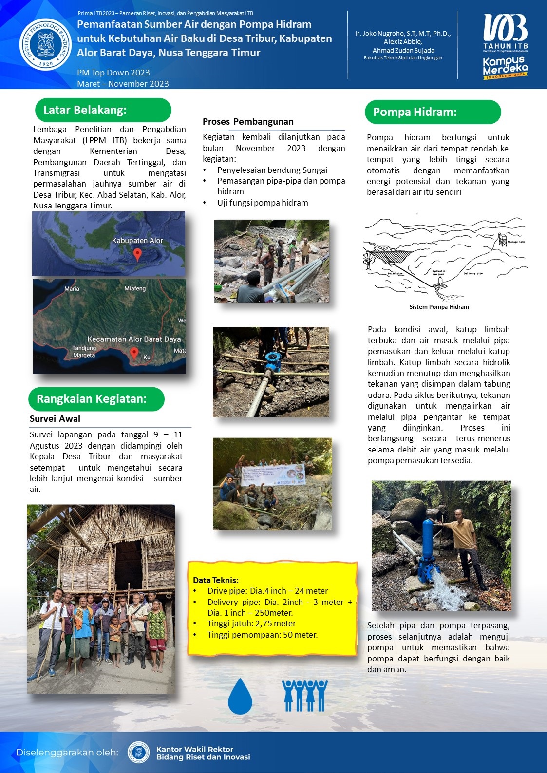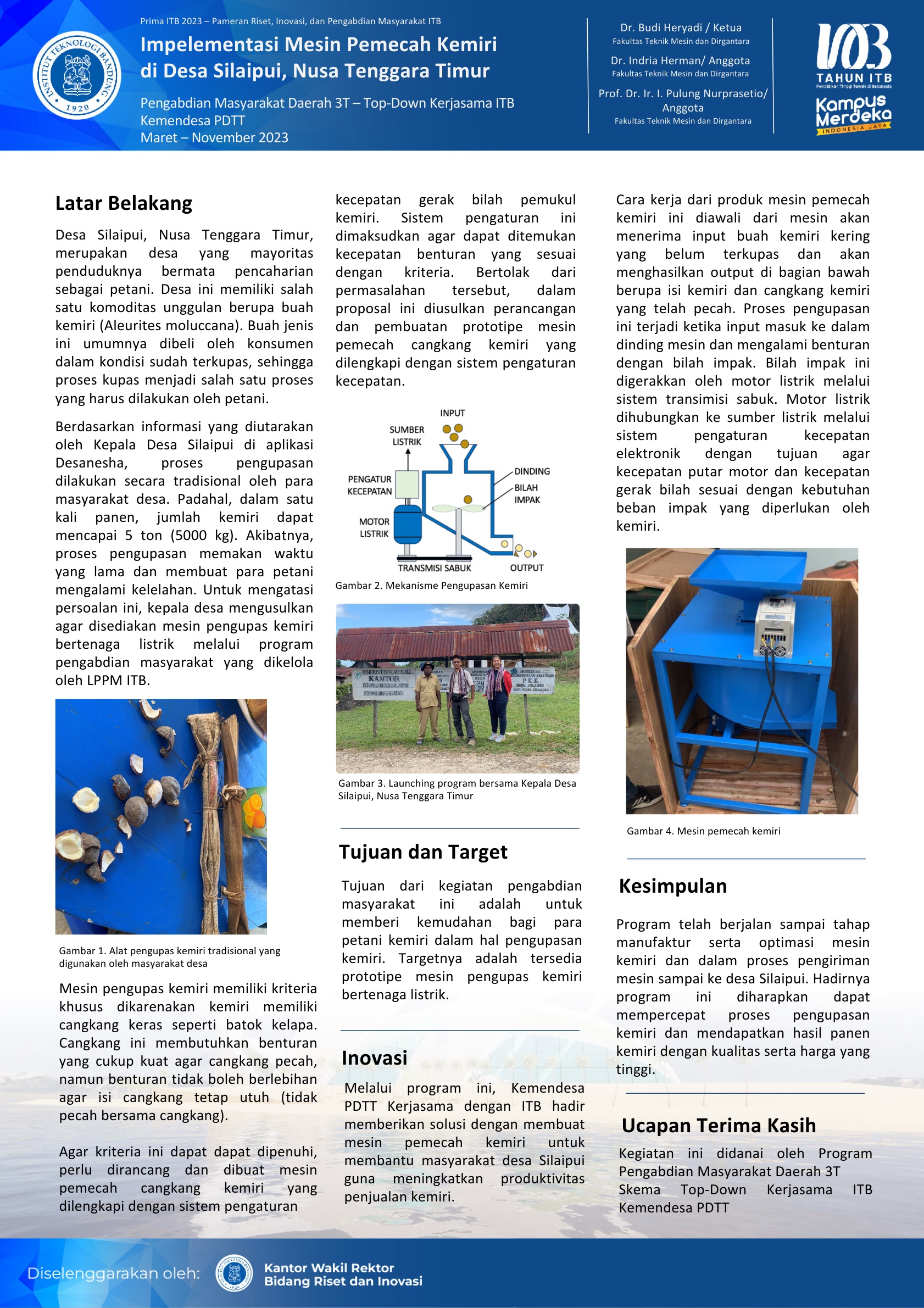 Direktorat Riset dan Pengabdian Masyarakat Institut Teknologi Bandung (DRPM ITB) dengan Kementerian Desa, Pembangunan Daerah Tertinggal dan Transmigrasi (Kemendes PDTT) untuk penerapan teknologi tepat guna di wilayah 3T (tertinggal, terdepan, dan terluar). Sebanyak 30 desa di Nusa Tenggara Timur dan Maluku Utara akan menjadi sasaran. Kategorinya terdiri atas 22 desa tertinggal dan 8 desa sangat tertinggal.